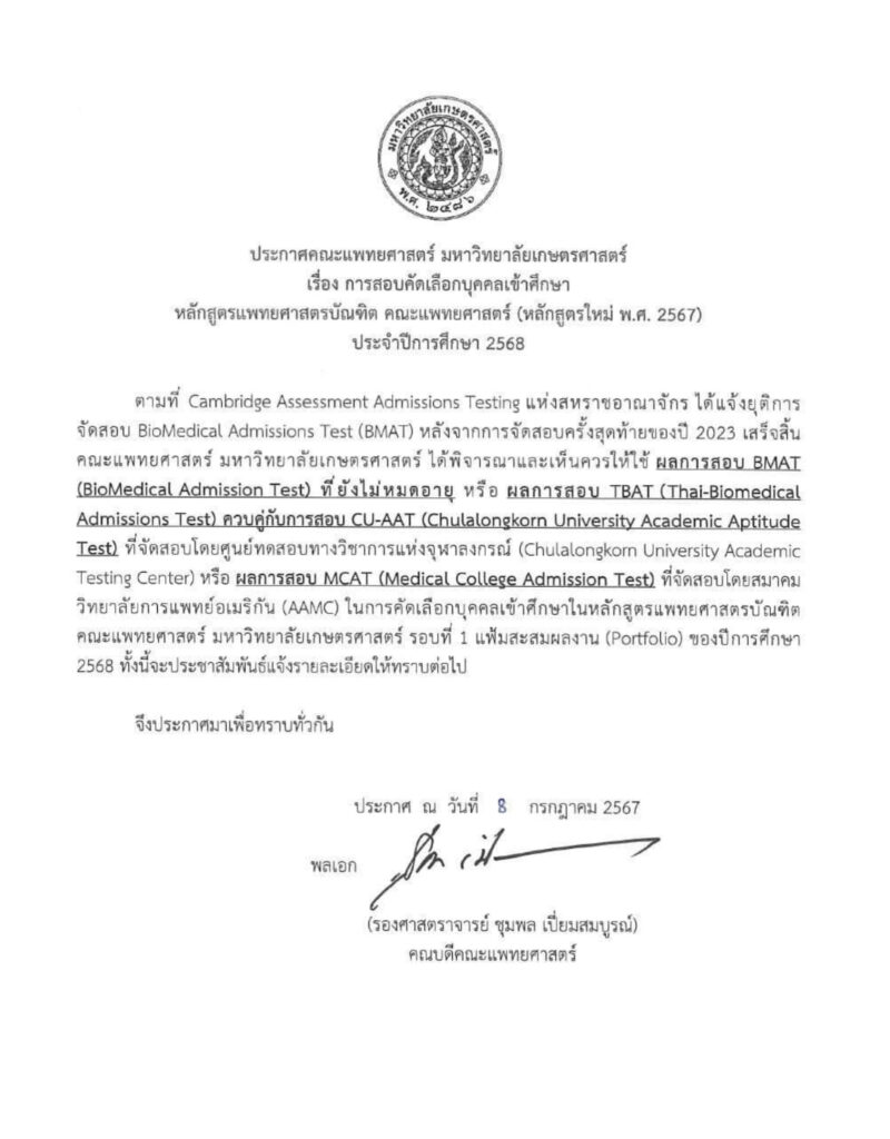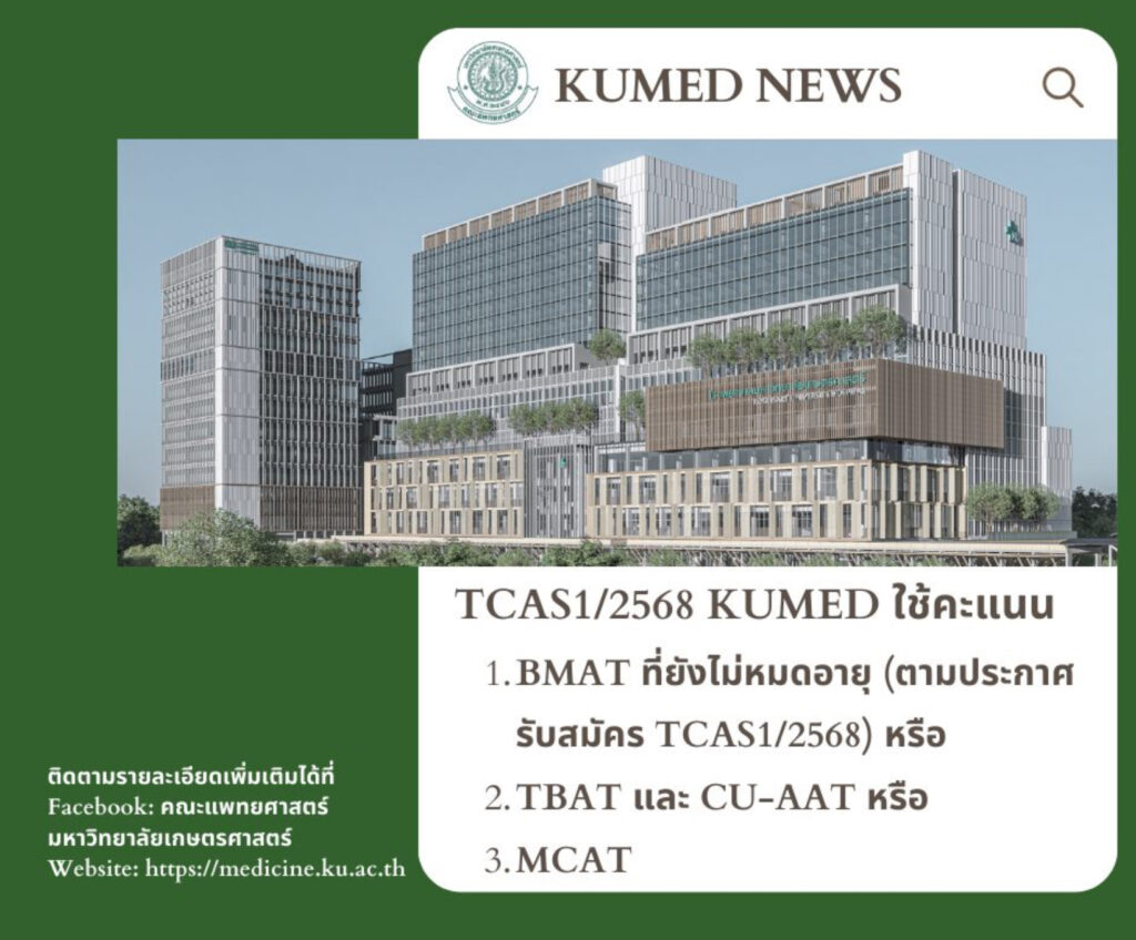 EZ Webmaster July 12, 2024 EZ Webmaster July 12, 2024 คณะแพทยศาสตร์ ม.เกษตรศาสตร์ ประกาศเกณฑ์ที่ต้องใช้ TCAS 68 รอบที่ 1 คณะแพทศาสตร์ มหาวิทยาลัยเกษตรศาสตร์ ประกาศ TCAS68 เกณฑ์ที่ใช้ยื่นสมัครในรอบ portfolio ดังนี้ สิ่งที่ต้องใช้เป็นองค์ประกอบคะแนนคัดเลือก สำหรับผู้ที่สนใจสามารถเตรียมข้อมูลดังนี้ TCAS1/2568 ทางคณะแพทยศาสตร์ มหาวิทยาลัยเกษตรศาสตร์ ใช้คะแนน 1. BMAT ที่ยังไม่หมดอายุ หรือ 2. TBAT ร่วมกับ CU-AAT หรือ 3. MCAT ด้านเกณฑ์คะแนนโปรดติดตามประกาศของคณะต่อไปคลิก