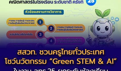 Blogครู-อาจารย์นักเรียน สสวท. ชวนครูไทยทั่วประเทศโชว์นวัตกรรม “Green STEM & AI” ในงาน วทร.25 ยกระดับห้องเรียนอนาคตสู่ความยั่งยืน EZ Webmaster February 26, 2026 สถาบันส่งเสริมการสอนวิทยาศาสตร์และเทคโนโลยี (สสวท.) จับมือมหาวิทยาลัยราชภัฏราชนครินทร์ (มรร.) และสมาคมครูวิทยาศาสตร์ คณิตศาสตร์และเทคโนโลยีแห่งประเทศไทย (สวคท.) ขอเชิญชวนครู อาจารย์ และบุคลากรทางการศึกษาทั่วประเทศ ส่งผลงานวิชาการเข้าร่วมนำเสนอในงาน “การประชุมวิชาการวิทยาศาสตร์ คณิตศาสตร์ในโรงเรียน ระดับชาติ ครั้งที่ 25…