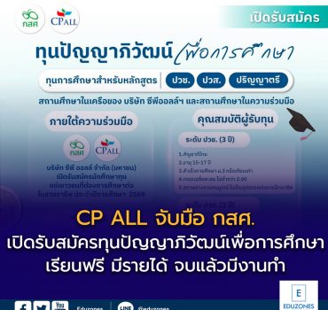 Blogทุนดีดีนักเรียน CP ALL จับมือ กสศ. เปิดรับสมัคร “ทุนปัญญาภิวัฒน์เพื่อการศึกษา” ปี 2569 เรียนฟรี มีรายได้ จบแล้วมีงานทำ EZ Webmaster February 26, 2026 CP ALL จับมือ กสศ. เปิดรับสมัคร “ทุนปัญญาภิวัฒน์เพื่อการศึกษา” ปี 2569 เรียนฟรี มีรายได้ จบแล้วมีงานทำ บริษัท ซีพี ออลล์ จำกัด (มหาชน)…