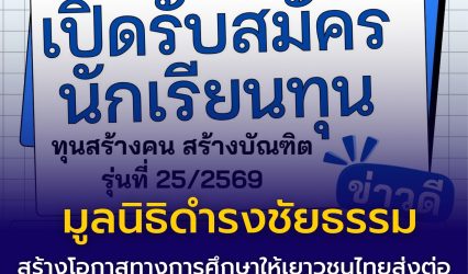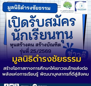 Blogนักศึกษานักเรียน มูลนิธิดำรงชัยธรรม สร้างโอกาสทางการศึกษาให้เยาวชนไทย ส่งต่อพลังแห่งการเรียนรู้ พัฒนาบุคลากรที่ดีสู่สังคม EZ Webmaster February 3, 2026 มูลนิธิดำรงชัยธรรม สร้างโอกาสทางการศึกษาให้เยาวชนไทยส่งต่อพลังแห่งการเรียนรู้ พัฒนาบุคลากรที่ดีสู่สังคม บ่มเพาะเมล็ดพันธุ์แห่งการเรียนรู้ สร้างบุคลากรคุณภาพสู่สังคม “มูลนิธิดำรงชัยธรรม” เดินหน้ามอบโอกาสทางการศึกษา เปิดรับสมัครนักเรียนทุน รุ่นที่ 25/2569 ตั้งแต่วันนี้ จนถึงวันที่ 13 กุมภาพันธ์ 2569 เพื่อช่วยเหลือเยาวชนที่เรียนดีแต่ขาดแคลนทุนทรัพย์ได้มีโอกาสเข้าถึงการศึกษา แบบครบวงจร โดยมอบทุนการศึกษาต่อเนื่องจนจบปริญญาตรีให้กับเยาวชนที่เรียนดี ความประพฤติดี ซึ่งครอบคลุมค่าใช้จ่ายที่มีความจำเป็นต่อการศึกษาและดำรงชีพ…