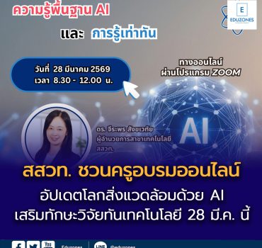 Blogครู-อาจารย์นักเรียน อัปเดตโลกสิ่งแวดล้อมด้วย AI สสวท. ชวนครูอบรมออนไลน์ เสริมทักษะวิจัยทันเทคโนโลยี 28 มี.ค. นี้ EZ Webmaster March 9, 2026 สถาบันส่งเสริมการสอนวิทยาศาสตร์และเทคโนโลยี (สสวท.) โดยโครงการ GLOBE ฝ่ายพัฒนาครูและบุคลากรทางการศึกษา เปิดรับสมัครครูเข้าร่วมอบรมออนไลน์ “หลักสูตรส่งเสริมศักยภาพการทำงานวิจัยวิทยาศาสตร์สิ่งแวดล้อม” ในหัวข้อ “ความรู้พื้นฐาน AI และการรู้เท่าทัน” เพื่อรู้เท่าทันสถานการณ์การเปลี่ยนแปลงของเทคโนโลยีและสิ่งแวดล้อม รวมถึงเสริมความเข้าใจเทคโนโลยีปัญญาประดิษฐ์และการประยุกต์ใช้กับงานวิจัยสิ่งแวดล้อม อบรมวันที่ 28 มีนาคม 2569 ผ่านระบบ Zoom พร้อมถ่ายทอดสดและรับชมย้อนหลังทาง Facebook: GLOBE Thailand และ GLOBE Thailand Family ผู้ลงทะเบียนรับชมถ่ายทอดสดมีสิทธิ์ลุ้นรับของที่ระลึก 5 รางวัล ครูที่เข้าอบรมผ่านทาง Zoom และผ่านเงื่อนไขจะได้รับเกียรติบัตร (นักเรียนร่วมฟังได้แต่ไม่ได้เกียรติบัตร)…