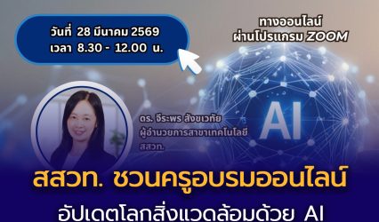 Blogครู-อาจารย์นักเรียน อัปเดตโลกสิ่งแวดล้อมด้วย AI สสวท. ชวนครูอบรมออนไลน์ เสริมทักษะวิจัยทันเทคโนโลยี 28 มี.ค. นี้ EZ Webmaster March 9, 2026 สถาบันส่งเสริมการสอนวิทยาศาสตร์และเทคโนโลยี (สสวท.) โดยโครงการ GLOBE ฝ่ายพัฒนาครูและบุคลากรทางการศึกษา เปิดรับสมัครครูเข้าร่วมอบรมออนไลน์ “หลักสูตรส่งเสริมศักยภาพการทำงานวิจัยวิทยาศาสตร์สิ่งแวดล้อม” ในหัวข้อ “ความรู้พื้นฐาน AI และการรู้เท่าทัน” เพื่อรู้เท่าทันสถานการณ์การเปลี่ยนแปลงของเทคโนโลยีและสิ่งแวดล้อม รวมถึงเสริมความเข้าใจเทคโนโลยีปัญญาประดิษฐ์และการประยุกต์ใช้กับงานวิจัยสิ่งแวดล้อม อบรมวันที่ 28 มีนาคม 2569 ผ่านระบบ Zoom พร้อมถ่ายทอดสดและรับชมย้อนหลังทาง Facebook: GLOBE Thailand และ GLOBE Thailand Family ผู้ลงทะเบียนรับชมถ่ายทอดสดมีสิทธิ์ลุ้นรับของที่ระลึก 5 รางวัล…