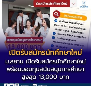 มหาวิทยาลัยสยาม เปิดรับสมัครนักศึกษาใหม่ พร้อมมอบทุนสนับสนุนการศึกษาสูงสุด 13,000 บาท EZ WebmasterMarch 23, 2026 “โอกาสทางการศึกษาที่ดี เริ่มต้นได้ที่มหาวิทยาลัยสยาม สมัครวันนี้เพื่ออนาคตที่มั่นคงของคุณ!” มหาวิทยาลัยสยาม ขอเชิญชวนนักเรียนผู้ที่สนใจศึกษาต่อในระดับอุดมศึกษา สมัครเข้าศึกษาต่อเป็นนักศึกษาใหม่ ประจำปีการศึกษา 2569 โดยเปิดโอกาสพิเศษมอบ ทุนสนับสนุนการศึกษาสูงสุด 13,000 บาท ** เงื่อนไขเป็นไปตามที่มหาวิทยาลัยกำหนด เพื่อช่วยแบ่งเบาภาระค่าใช้จ่ายทางการศึกษา สำหรับผู้ที่สนใจ สามารถสมัครได้ที่ ศูนย์รับสมัครนักศึกษาใหม่…