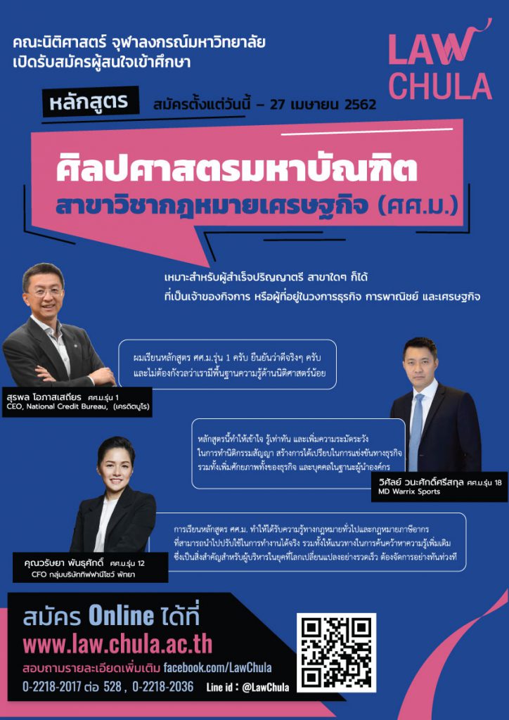 EZ Webmaster April 23, 2019 EZ Webmaster April 23, 2019 คณะนิติศาสตร์ จุฬาฯ เปิดรับสมัครผู้สนใจหลักสูตรวิชากฎหมาย คณะนิติศาสตร์ จุฬาลงกรณ์มหาวิทยาลัย หนึ่งในสถาบันการศึกษาทางนิติศาสตร์ที่ได้รับการยอมรับระดับโลก จากการจัดอันดับ ติดท็อป 200 ของโลก โดย QS World University Rankings by Subject 2019 กำลังเปิดรับสมัครผู้สนใจเรียนนิติศาสตร์ ดังนี้ หลักสูตรศิลปศาสตรมหาบัณฑิต สาขาวิชากฎหมายเศรษฐกิจ เหมาะสำหรับผู้ประกอบอาชีพ หรือประสงค์จะประกอบการด้านเศรษฐกิจ การพาณิชย์ และภาษีอากร โดยรับสมัครผู้จบปริญญาตรีทุกสาขา เปิดรับสมัครถึงวันที่ 27 เมษายนศกนี้ หลักสูตร LL.M. (Business Law) International Program สำหรับนิติศาสตรบัณฑิตที่ ต้องการศึกษากฎหมายธุรกิจเป็นภาษาอังกฤษ กับอาจารย์ผู้เชี่ยวชาญจากหลากหลาย ประเทศ โดยไม่จำเป็นเดินทางไปศึกษาต่อที่ต่างประเทศ โดยจะเปิดรับสมัครถึงวันที่ 2 พฤษภาคมศกนี้ หลักสูตรนิติศาสตรดุษฎีบัณฑิต สำหรับนิติศาสตรมหาบัณฑิตที่สนใจศึกษาวิจัยประเด็นปัญหาทางนิติศาสตร์ในเชิงลึก โดยจะเปิดรับสมัครถึงวันที่ 1 พฤษภาคมศกนี้ สามารถสมัครออนไลน์ได้ที่ www.law.chula.ac.th และสอบถามรายละเอียดเพิ่มเติมได้ที่ 0-2218-2017 หรือ facebook.com/LawChula และ Line id : @LawChula