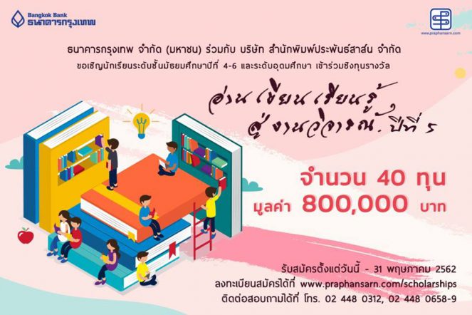 tui sakrapee April 27, 2019 40 ทุนให้นักเรียน นักศึกษา ร่วมโครงการ “อ่าน เขียน เรียนรู้ สู่งานวิจารณ์ ปีที่ 5” tui sakrapee April 27, 2019 ธนาคารกรุงเทพ จำกัด (มหาชน) ร่วมกับ บริษัท สำนักพิมพ์ประพันธ์สาส์น จำกัด ขอเชิญน้องๆ นักเรียนชั้นมัธยมศึกษา ปีที่ 4-6 และ นิสิต นักศึกษาในระดับอุดมศึกษา เข้าร่วมโครงการอ่าน เขียน เรียนรู้ สู่งานวิจารณ์ ปีที่ 5 ชิงทุนรางวัล 20,000 บาท จำนวน 40 ทุนรางวัล เป็นจำนวนเงินทั้งสิ้น 800,000 บาท คุณสมบัติผู้สมัคร 1. เป็นผู้ที่กำลังศึกษาระดับชั้นมัธยมศึกษาปีที่… Continue Reading