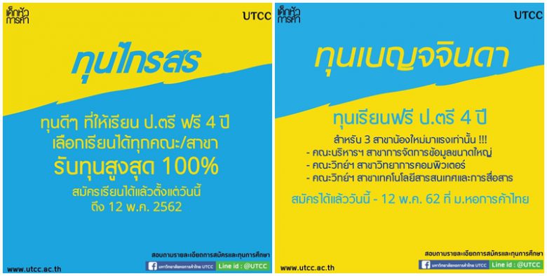 tui sakrapee April 25, 2019 ม.หอการค้าไทยเปิดให้ทุนไกรสร จันศิริ และ ทุนเบญจจินดาแก่เยาวชนเรียนดีแต่ขาดทุนทรัพย์ tui sakrapee April 25, 2019 ทุนไกรสร จันศิริ และ ทุนเบญจจินดา เป็นทุนการศึกษาระดับปริญญาตรีที่ได้รับการสนับสนุนจากสมาชิกหอการค้า และสภาหอการค้าไทย ที่ต้องการให้โอกาสทางการศึกษาและพัฒนาประสบการณ์อาชีพแก่เยาวชนที่เรียนดีแต่ขาดแคลนทุนทรัพย์ โดยเริ่มตั้งแต่ปีการศึกษา 2562 จะสนับสนุนทุนการศึกษาทั้งภาคต้นและภาคปลายให้แก่นักศึกษา เป็นระยะเวลา 4 ปี โดยผู้รับทุนการศึกษาต้องรักษาเกรดเฉลี่ยสะสมไม่ต่ำกว่า 3.00 ต่อเทอม และในภาคฤดูร้อนจะเป็นการสนับสนุนด้านการพัฒนาอาชีพโดยอนุญาตให้นักศึกษาได้มีโอกาสฝึกงานในสถานประกอบการของสมาชิกหอการค้า และสภาหอการค้าไทย (ในกรณี ผู้รับทุนมีเกรดเฉลี่ยสะสมต่ำกว่า 3.00 จะถูกระงับทุนการศึกษาในภาคเรียนถัดไปจนกว่าจะมีเกรดเฉลี่ยสะสมไม่ต่ำกว่า 3.00 อีกครั้งหนึ่ง จึงจะได้รับทุนการศึกษาในภาคเรียนถัดไป) สำหรับทุนไกรสร จันศิริ ผู้รับทุนสามารถเลือกศึกษาระดับปริญญาตรีในคณะ และสาขาใดก็ได้ สำหรับทุนเบญจจินดา ให้ทุนสำหรับผู้รับทุนที่มีความสนใจศึกษาระดับปริญญาตรีต่อในคณะ… Continue Reading