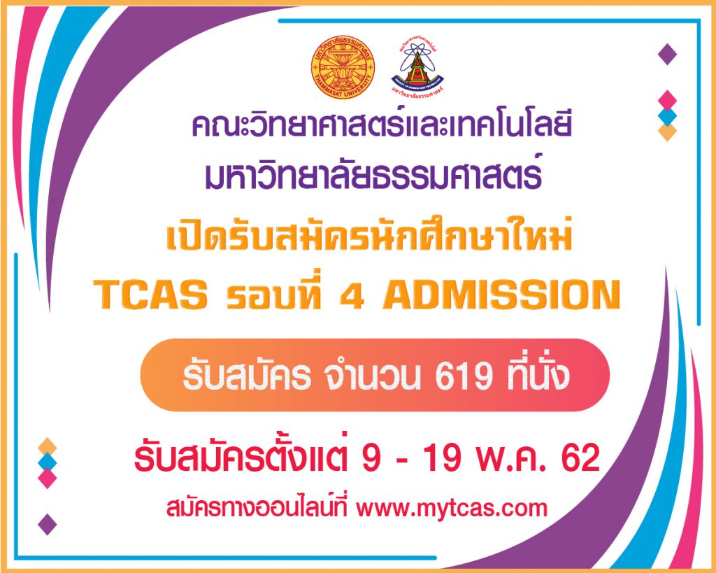 EZ Webmaster May 15, 2019 EZ Webmaster May 15, 2019 วิทยาศาสตร์ฯ มธ. เปิดรับ TCAS 4 รอบแอดมิชชั่น จำนวน 619 ที่นั่ง คณะวิทยาศาสตร์และเทคโนโลยี มหาวิทยาลัยธรรมศาสตร์ (มธ.) เปิดรับสมัครTCAS62รอบ 4 แอดมิชชั่น สำหรับนักเรียนชั้นมัธยมศึกษาปีที่ 6 หรือเทียบเท่า เข้าศึกษาต่อในระดับปริญญาตรี หลักสูตรวิทยาศาสตรบัณฑิต ในโครงการภาคปกติ 16 หลักสูตร จำนวน 442 ที่นั่ง อาทิ สาขาวิทยาการคอมพิวเตอร์ สาขาเคมี สาขาวัสดุศาสตร์ สาขาวิทยาศาสตร์และนวัตกรรมทางอาหาร ฯลฯ เป็นต้น รวมถึงโครงการพิเศษ 7 หลักสูตร จำนวน 177 ที่นั่ง อาทิ สาขาวิทยาศาสตร์และนวัตกรรมข้อมูล สาขาคณิตศาสตร์การจัดการ สาขาเทคโนโลยีพลังงานชีวภาพและการแปรรูปเคมีชีวภาพ ฯลฯ เป็นต้น รวมทั้งสิ้น 619 ที่นั่ง โดยผู้สนใจสามารถตรวจสอบคุณสมบัติ และสมัครออนไลน์ได้ที่ http://mytcas.com/ ได้ตั้งแต่วันนี้ – วันที่ 19 พฤษภาคม 2562 สอบถามรายละเอียดเพิ่มเติมได้ที่ งานวิชาการและกิจการนักศึกษา คณะวิทยาศาสตร์และเทคโนโลยี มธ. ศูนย์รังสิต โทรศัพท์ 0-2564-4440 ต่อ 2002, 2020, 2045 เว็บไซต์ www.sci.tu.ac.th หรือเฟซบุ๊ก www.facebook.com/ScienceThammasat