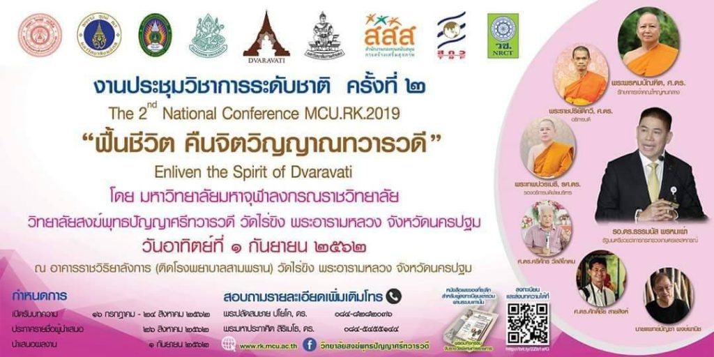 tui sakrapee August 26, 2019 tui sakrapee August 26, 2019 มหาวิทยาลัยมหาจุฬาฯ วิทยาลัยสงฆ์พุทธปัญญาศรีทวารวดี จัดประชุมวิชาการ “ฟื้นชีวิตจิตวิญญาณทวารวดี” มหาวิทยาลัยมหาจุฬาลงกรณราชวิทยาลัย วิทยาลัยสงฆ์พุทธปัญญาศรีทวารวดี วัดไร่ขิง พระอารามหลวง จังหวัดนครปฐม จัดงานประชุมวิชาการระดับชาติ ครั้งที่ 2 The 2 nd National Conference (MCU.RปัK 2019) ในหัวข้อ “ฟื้นชีวิตจิตวิญญาณทวารวดี” Enliven the Spirit of Dvaravati ในวันที่ 1 กันยายน 2562 ณ อาคารราชวิริยาลังการ (ติดโรงพยาบาลสามพราน) วัดไร่ขิง พระอารามหลวง จังหวัดนครปฐม พร้อมปาฐกถาพิเศษ และเสวนาทางวิชาการ โดยวิทยากรที่มีชื่อเสียง ประกอบด้วย ศ.ดร. พระพรหมบัณฑิต รักษาการเจ้าคณะใหญ่หนกลาง ศ.ดร.พระราชปริยัติกวี อธิการบดีฯ ร.อ. ดร.ธรรมนัส พรหมเผ่า รัฐมนตรีช่วยว่าการกระทรวงเกษตรและสหกรณ์ ศ.ดร.ศรีศักร วัลลิโภดม ศ.ดร.ศักดิ์ชัย สายสิงห์ และนายแพทย์บัญชา พงษ์พานิช ผู้สนใจ สอบถามรายละเอียดเพิ่มเติม ดร.พระปลัดสมชาย ปโยโค 084 828 2036 ดร.พระมหาประกาศิต สิริเมโธ 084 545 5144 www.rk.mcu.ac.th facebook: วิทยาลัยสงฆ์พุทธปัญญาศรีทวารวดี