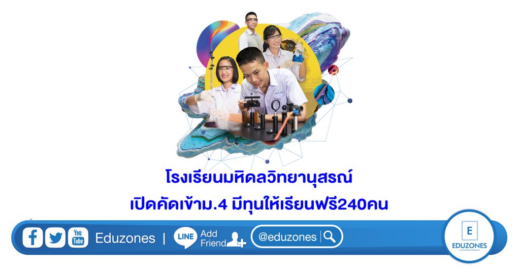 EZ Webmaster August 29, 2019 EZ Webmaster August 29, 2019 โรงเรียนมหิดลวิทยานุสรณ์เปิดคัดเข้าม.4 มีทุนให้เรียนฟรี240คน โรงเรียนมหิดลวิทยานุสรณ์ เป็นโรงเรียนวิทยาศาสตร์ของรัฐ มีภารกิจในการพัฒนาต้นแบบและนําร่อง เกี่ยวกับการสรรหาและจัดการศึกษาสําหรับผู้มีความสามารถพิเศษด้านคณิตศาสตร์และวิทยาศาสตร์ ระดับมัธยมศึกษา ตอนปลาย เพื่อพัฒนาส่งเสริมให้นักเรียนเหล่านี้มีจิตวิญญาณ และมีความมุ่งมั่นที่จะประกอบอาชีพ เป็นนักวิจัย นักประดิษฐ์คิดค้นด้านคณิตศาสตร์ วิทยาศาสตร์และเทคโนโลยี ที่มีคุณภาพเทียบเคียงกับนักวิจัย นักประดิษฐ์คิดค้น ชั้นนําของนานาประเทศ มีความเป็นไทย มีความมุ่งมั่นที่จะช่วยพัฒนาประเทศชาติ ตอบแทนแผ่นดินเกิดตามศักยภาพ ของตนเอง และมีเจตคติที่ดีต่อเพื่อนร่วมโลกและธรรมชาติ โรงเรียนมหิดลวิทยานุสรณ์มีความประสงค์จะรับสมัครนักเรียนที่กําลังเรียนชั้นมัธยมศึกษาปีที่ 3 หรือเทียบเท่า ปีการศึกษา 2562 เพื่อคัดเลือกเข้าเป็นนักเรียนชั้นมัธยมศึกษาปีที่ 4 ปีการศึกษา 2563 โรงเรียนมหิดลวิทยานุสรณ์ จํานวน 240 คน คุณสมบัติของผู้สมัคร – กําลังศึกษาอยู่ในชั้นมัธยมศึกษาปีที่ 3 หรือเทียบเท่า ปีการศึกษา 2562 1.2 มีผลการเรียน ดังนี้ -ระดับคะแนนเฉลี่ยสะสมรวมทุกรายวิชา ในชั้นมัธยมศึกษาปีที่ 1 และ 2 ไม่ต่ํากว่า 3.00 -ระดับคะแนนเฉลี่ยสะสมกลุ่มสาระการเรียนรู้วิทยาศาสตร์ ในชั้นมัธยมศึกษาปีที่ 1 และ 2 ไม่ต่ํากว่า 3.00 -ระดับคะแนนเฉลี่ยสะสมกลุ่มสาระการเรียนรู้คณิตศาสตร์ ในชั้นมัธยมศึกษาปีที่ 1 และ 2 ไม่ต่ํากว่า 3.00 -มีสัญชาติไทยและมีเลขประจําตัวประชาชน -ไม่เป็นโรคที่เป็นอุปสรรคต่อการศึกษาและการพักในห้องพักของโรงเรียน – มีความขยันหมั่นเพียร มีความประพฤติดีและมีบุคลิกภาพเหมาะสม -มีความตั้งใจเข้าเรียนในโรงเรียนมหิดลวิทยานุสรณ์ และสนใจศึกษาต่อระดับอุดมศึกษาด้านคณิตศาสตร์ วิทยาศาสตร์และเทคโนโลยี โดยได้รับการสนับสนุนจากผู้ปกครอง -สามารถพักอยู่ในโรงเรียนในลักษณะโรงเรียนประจําได้และยินดีปฏิบัติตามระเบียบของโรงเรียนในปัจจุบัน หรือที่จะได้มีการกําหนดในอนาคต ระยะเวลาการสมัคร เปิดรับสมัครตั้งแต่วันที่ 1 – 31 สิงหาคม 2562 นักเรียนที่ผ่านการคัดเลือก ไม่ต้องเสียค่าใช้จ่ายใดๆ นักเรียนทุกคนเป็นนักเรียนทุน ได้รับทุนสนับสนุนการศึกษาตลอด 3 ปี เป็นค่าหอพัก ค่าอาหาร รวมถึงได้รับชุดนักเรียน ชุดพละ และชุดนอน ที่มาและสอบถามข้อมูลเพิ่มเติมที่ ฝ่ายวิชาการ โรงเรียนมหิดลวิทยานุสรณ์ 364 หมู่ 5 ต.ศาลายา อ.พุทธมณฑล จ.นครปฐม 73170 โทร. 0 2826 7154-7, 0 2826 7159-60