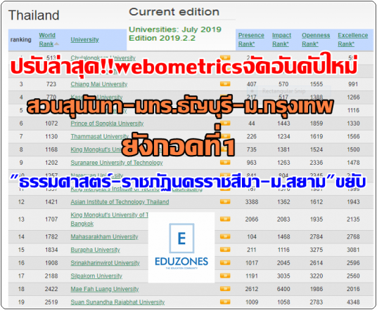 tui sakrapee August 10, 2019 tui sakrapee August 10, 2019 หมายเหตุ: ข้อมูลอันดับจากการปรับเปลี่ยนล่าสุด จนถึงวันที่ 10 ส.ค.62 ของ http://www.webometrics.info/en/Asia/Thailand ทำให้อันดับบางมหาวิทยาลัยปรับเปลี่ยนไปด้วย โดยผู้สนใจสามารถเข้าไปตรวจสอบในเว็บไซต์ดังกล่าวได้ …………………………………………………………… webometrics อัพเดทผลการจัดอันดับเป็น Edition 2019.2.2 โดยผลล่าสุดจนถึงวันที่่ 10 ส.ค.นี้ “จุฬาฯ” ยังครองอันดับ 1 ของประเทศ แต่ “ธรรมศาสตร์” อันดับขยับขึ้นมาอยู่ที่ 7 จากเดิมที่ 8 ของประเทศ ในการจัดอันดับคุณภาพด้านวิชาการของเวบโบเมตริกส์จากประเทศสเปน ด้าน “สวนสุนันทา”… Continue Reading