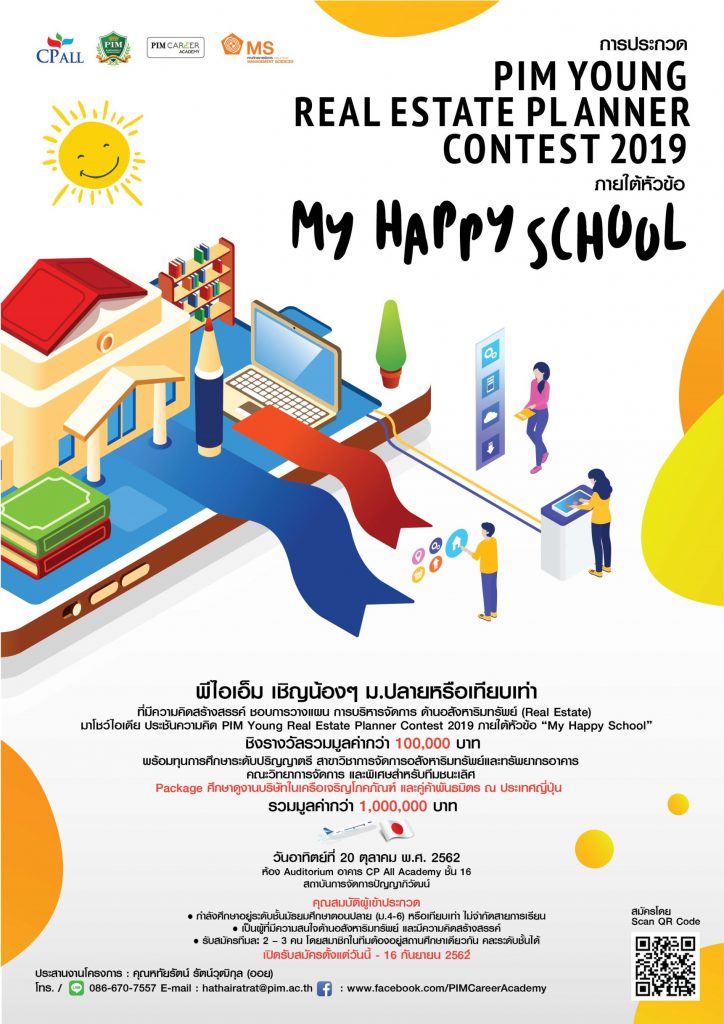 EZ Webmaster September 6, 2019 EZ Webmaster September 6, 2019 พีไอเอ็ม เชิญน้องๆ ม.ปลายหรือเทียบเท่า ประกวด PIM Young Real Estate Planner Contest 2019 พีไอเอ็ม เชิญน้องๆ ม.ปลายหรือเทียบเท่า ที่มีความคิดสร้างสรรค์ ชอบการวางแผน การบริหารจัดการด้านอสังหาริมทรัพย์ (Real Estate) มาโชว์ไอเดีย ประชันความคิด ในการประกวด PIM Young Real Estate Planner Contest 2019 ภายใต้หัวข้อ “My Happy School” ชิงรางวัลรวมมูลค่ากว่า 100,000 บาท พร้อมทุนการศึกษา สาขาวิชาการจัดการอสังหาริมทรัพย์และทรัพยากรอาคาร คณะวิทยาการจัดการและพิเศษสำหรับทีมชนะเลิศ Package ศึกษาดูงานบริษัทในเครือเจริญโภคภัณฑ์ และคู่ค้าพันธมิตร ณ ประเทศญี่ปุ่น รวมมูลค่าว่า 1,000,000 บาท มาร่วมกันสร้างโรงเรียนแห่งความสุข โดยการจัดสรรพื้นที่ จัดสรรทรัพยากรภายในโรงเรียน สร้างโรงเรียนให้น่าอยู่ น่าเรียน เสริมสร้างการเรียนรู้ และเหมาะกับการพัฒนาศักยภาพแก่นักเรียน ครู และบุคลากรภายในโรงเรียน ให้อยู่ร่วมกันอย่างมีความสุข ในรูปแบบ “My Happy School” ที่ทุกคนในโรงเรียนมีสุขภาพกายและสุขภาพใจที่แข็งแรง พร้อมรับมือกับทุกสถานการณ์ มีน้ำใจเอื้ออาทรต่อกัน มีสภาพแวดล้อม สังคมที่ดี ใช้ทรัพยากรและพลังงานอย่างคุ้มค่า เพื่อคุณภาพชีวิตและโรงเรียนที่ยั่งยืน กติกาการเข้สร่วมประกวด เพียงส่งคลิป VDO แนวคิดการสร้างสรรค์ My Happy School โดยการจัดสรร พื้นที่ ทรัพยากรและสิ่งแวดล้อม ภายในโรงเรียนความยาว 5-7 นาที เปิดรับสมัครตั้งแต่วันนี้ – 16 กันยายน 2562 ประกาศรายชื่อผู้มีสิทธิ์เข้าร่วมประกวด วันที่ 25 กันยายน 2562 วันประกวด : วันอาทิตย์ที่ 20 ตุลาคม 2562 เวลา 08.00 – 17.00 น. ณ ห้อง Auditorium อาคาร CP All Academy ชั้น 16 สถาบันการจัดการปัญญาภิวัฒน์ อ่านรายละเอียดได้ที่ https://www.pim.ac.th/pim/event/realestateplanner2019 https://forms.gle/BQhbDMeLbwU1d5H99 สอบถามข้อมูลเพิ่มเติมได้ทาง Inbox หรือ พี่ออย หทัยรัตน์ รัตน์วุฒิกุล โทร./Line 0866707557 E-mail: hathairatrat@pim.ac.th