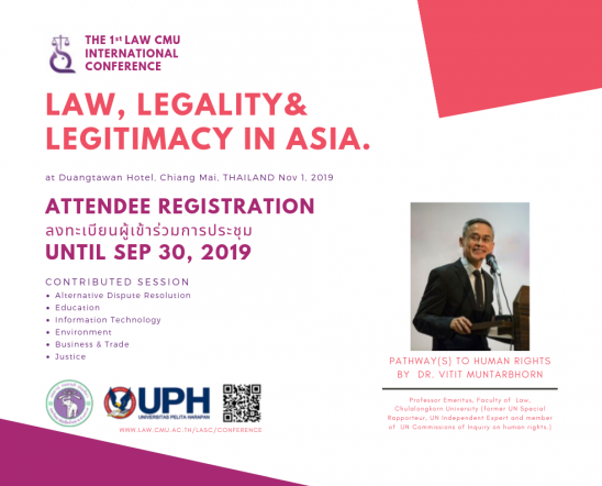 EZ Webmaster September 3, 2019 คณะนิติศาสตร์เชิญชวนผู้ที่สนใจเข้าร่วมงานประชุมวิชาการสาขานิติศาสตร์ระดับนานาชาติ หัวข้อ Law, Legality & Legitimacy in Asia EZ Webmaster September 3, 2019 คณะนิติศาสตร์ มหาวิทยาลัยเชียงใหม่ เชิญชวนผู้ที่สนใจลงทะเบียนเข้าร่วมงานประชุมวิชาการสาขานิติศาสตร์ระดับนานาชาติ ครั้งที่ 1 (The 1st Law CMU International Conference : Law, Legality & Legitimacy in Asia) ซึ่งจะจัดขึ้นในวันที่ 1 พฤศจิกายน 2562 ณ โรงแรมดวงตะวัน จังหวัดเชียงใหม่ โดยมีค่าลงทะเบียน 1,200.- บาท ลงทะเบียนได้ตั้งแต่วันที่ – 30 กันยายน… Continue Reading