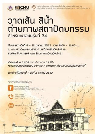 EZ Webmaster September 4, 2019 อบรมวาดเส้น สีน้ำและถ่ายภาพสถาปัตยกรรม สำหรับเยาวชน รุ่นที่ 24 วันที่ 8 – 12 ตุลาคม 2562 EZ Webmaster September 4, 2019 คณะสถาปัตยกรรมศาสตร์ มหาวิทยาลัยเชียงใหม่ เปิดรับสมัครนักเรียนระดับชั้นมัธยมศึกษา (ม.1-ม.6) เพื่อเข้าร่วมโครงการอบรมช่วงปิดภาคเรียนหลักสูตร “วาดเส้น สีน้ำและถ่ายภาพสถาปัตยกรรม สำหรับเยาวชน รุ่นที่ 24” ระหว่างวันที่ 8 – 12 ตุลาคม 2562 เวลา 09.00-16.00 น. ณ คณะสถาปัตยกรรมศาสตร์ มหาวิทยาลัยเชียงใหม่ และ ศูนย์สถาปัตยกรรมล้านนา สี่แยกกลางเวียงเชียงใหม่ ถนนราชดำเนิน อ.เมือง จ.เชียงใหม่ โดยวิทยากรที่มีความรู้ ความสามารถทางด้านการวาดเส้น การเขียนภาพสีน้ำ และการถ่ายภาพสถาปัตยกรรม … Continue Reading