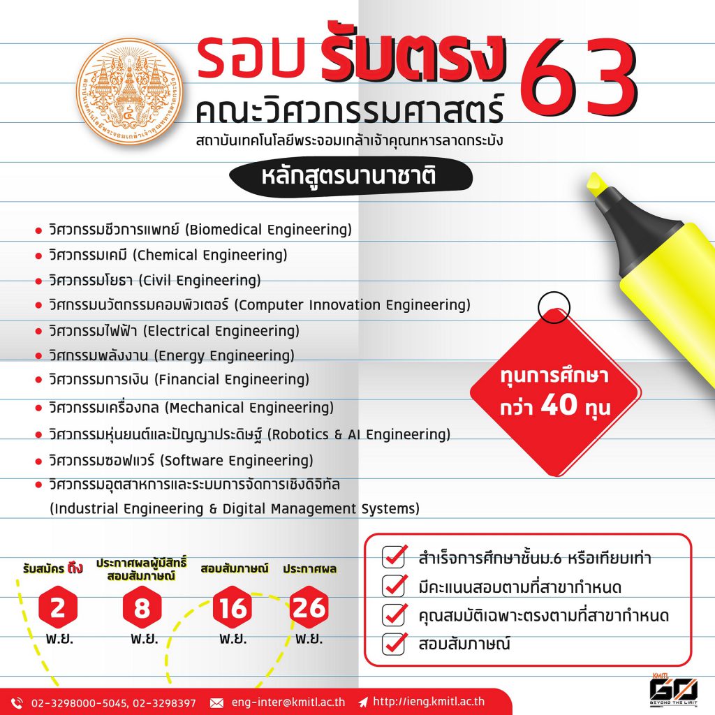 EZ Webmaster October 2, 2019 EZ Webmaster October 2, 2019 สจล. เปิดรับตรง “วิศวกรรมศาสตร์ นานาชาติ” 2563 สถาบันเทคโนโลยีพระจอมเกล้าเจ้าคุณทหารลาดกระบัง (สจล.) เปิดรับสมัครนักเรียนชั้นมัธยมศึกษาปีที่ 6 สายวิทยาศาสตร์-คณิตศาสตร์ หรือเทียบเท่า เข้าศึกษาต่อในระดับปริญญาตรี ของคณะวิศวกรรมศาสตร์ ใน 11 หลักสูตรนานาชาติ ได้แก่ วิศวกรรมชีวการแพทย์ วิศวกรรมเคมี วิศวกรรมโยธา วิศวกรรมนวัตกรรมคอมพิวเตอร์ วิศวกรรมไฟฟ้า วิศวกรรมพลังงาน วิศวกรรมการเงิน วิศวกรรมอุตสาหการและระบบการจัดการ วิศวกรรมเครื่องกล วิศวกรรมหุ่นยนต์และปัญญาประดิษฐ์ และวิศวกรรมซอฟแวร์ ด้วยมาตรฐานหลักสูตรและการเรียนการสอนระดับเวิร์ลคลาส เพื่อให้พร้อมก้าวสู่การเป็นวิศวกรรุ่นใหม่ ที่มีความรู้จริงในสายวิชาชีพ มีศักยภาพในการแข่งขันในเวทีระดับนานาชาติ และก้าวทันความเปลี่ยนแปลงของโลกและเทคโนโลยีด้านวิศวฯ ทั้งนี้ ผู้สนใจสามารถตรวจสอบคุณสมบัติและสมัครออนไลน์ได้ที่ http://eneng.kmitl.ac.th/inter-admission-direct ตั้งแต่วันนี้ – 2 พฤศจิกายน 2562 สอบถามเพิ่มเติมได้ที่ คณะวิศวกรรมศาสตร์ สจล. (หลักสูตรนานาชาติ) โทรศัพท์ 02-329-8000 #5045 หรือ 02-329-8397 เว็บไซต์ http://ieng.kmitl.ac.th และ www.facebook.com/KMITL.SIIE