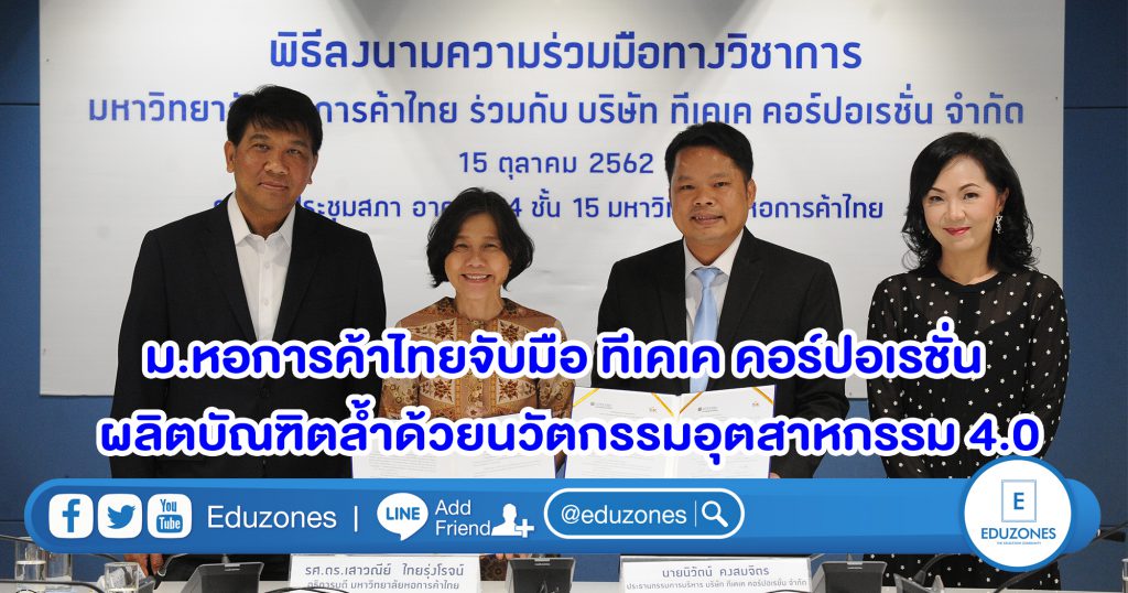 EZ Webmaster October 16, 2019 EZ Webmaster October 16, 2019 ม.หอการค้าไทยจับมือ ทีเคเค คอร์ปอเรชั่น ผลิตบัณฑิตล้ำด้วยนวัตกรรมอุตสาหกรรม 4.0 มหาวิทยาลัยหอการค้าไทย สถาบันการศึกษาชั้นนำด้านธุรกิจ การค้า และอุตสาหกรรมการบริการ เน้นการสร้างนักศึกษาให้เป็นผู้ประกอบการ และ ส่งเสริม Lifelong Learning หรือการเรียนรู้ตลอดชีวิต ซึ่งสำคัญมากในยุคปัจจุบัน ดังนั้น มหาวิทยาลัยฯ จึงมีเป้าหมายในการเพิ่มพูนศักยภาพของผู้บริหาร และผู้ประกอบการด้วยเช่นกัน เพื่อยกระดับความสามารถในการแข่งขันของธุรกิจไทยให้ก้าวไปยืนอยู่ในตลาดระดับโลกได้ ล่าสุดมหาวิทยาลัยหอการค้าไทยจับมือบริษัท ทีเคเค คอร์ปอเรชั่น จำกัด ผู้จัดจำหน่ายสินค้าในระบบควบคุมการผลิตอัตโนมัติในโรงงาน โดยทีมงานวิศวกรที่เชี่ยวชาญมากด้วยประสบการณ์คอยให้คำปรึกษา แนะนำเกี่ยวกับงานวิศวกรรมควบคุมทุกด้าน รวมถึงการบริการรับดูแลออกแบบ งานสร้าง ปรับปรุงและพัฒนาระบบต่าง ๆ การร่วมมือครั้งนี้ของมหาวิทยาลัยและบริษัททีเคเค คอร์ปอเรชั่น จำกัด เพื่อมุ่งเสริมศักยภาพและผลิตบัณฑิตให้ตอบโจทย์อุตสาหกรรมไทยแลนด์4.0 โดยให้ผู้เชี่ยวชาญและพนักงานทีเคเคเป็นผู้บรรยายและสอนปฏิบัติในหัวข้อต่างๆ พัฒนานักศึกษาให้ตรงกับความต้องการของตลาด นอกจากนี้มหาวิทยาลัยหอการค้าไทยสามารถส่งอาจารย์ที่มีความเชี่ยวชาญทางด้านที่บริษัทต้องการพัฒนาให้กับเจ้าหน้าที่หรือผู้บริหารทีเคเคมุ่งสร้างประโยชน์ให้ทั้งสององค์กร ที่สำคัญความร่วมมือกันในการแลกเปลี่ยนวิชาการระหว่างกัน และการทำวิจัยร่วมกันเพื่อเป็นแนวทางในการพัฒนาธุรกิจ นักศึกษามหาวิทยาลัยหอการค้าไทยสามารถศึกษาดูงาน ฝึกงาน และสหกิจศึกษาเป็นการสนับสนุนและสร้างเครือข่ายด้านการศึกษาร่วมกัน รองศาสตราจารย์ ดร.เสาวณีย์ ไทยรุ่งโรจน์ อธิการบดีมหาวิทยาลัยหอการค้าไทย เปิดเผยว่า “ม.หอการค้าไทยรู้สึกเป็นเกียรติและขอขอบคุณบริษัท ทีเคเค คอร์ปอเรชั่น จำกัดเป็นอย่างมากในการร่วมมือกันครั้งนี้ มหาวิทยาลัยในฐานะสถาบันการศึกษาเอกชนชั้นนำทางธุรกิจและอุตสาหกรรมบริการของประเทศไทย เรามุ่งสร้างและผลิตบัณฑิตให้ตอบโจทย์อุตสาหกรรมไทยแลนด์4.0 เพื่อสร้างรากฐานที่แข็งแกร่งให้นักศึกษาทุกๆ คณะสู่การเป็นกำลังพลที่สำคัญในการสร้างสรรค์คุณภาพที่ดีให้กับเศรษฐกิจประเทศ ปัจจุบันเข้าสู่ยุคดิจิทัลดิสรัปชั่น (digital disruption) จากกระแสการขยายตัวของสื่อดิจิทัล ต้องปรับเปลี่ยนกลยุทธ์และรูปแบบการทำงานให้กับนักศึกษา การร่วมมือครั้งนี้ไม่เพียงร่วมมือทางวิชาการระหว่างสององค์กร เรายังได้สนั