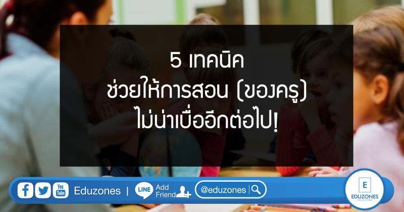 EZ Webmaster November 27, 2019 EZ Webmaster November 27, 2019 5 เทคนิคช่วยให้การสอน (ของครู) ไม่น่าเบื่ออีกต่อไป ในการเรียนการสอนที่มีเนื้อหาอัดแน่น มีองค์ความรู้และทฤษฎีต่างๆ มากมายแล้วนั้น ก็คงจะไม่แปลกที่จะทำให้เด็กๆเบื่อหน่ายกับการเรียน ซึ่งก็ส่งผลต่อความสนใจในการเรียนและยากต่อการสอนของครูด้วย เพราะยิ่งวิชาไหนเนื้อหาหนัก เนื้อหาแน่นคนสอนก็เหนื่อย คนเรียนก็เบื่อ วันนี้เราจึงมีเทคนิคดีๆ ที่จะช่วยให้การเรียนการสอนของครูไม่น่าเบื่อ และน่าสนใจเพิ่มขึ้นด้วยมาฝากกันค่ะ 1 วางตำราแล้วพาไปลงมือทำ ถึงแม้ในหลายวิชาการเปิดตำราและอ้างอิงทฤษฎีต่างๆ จะสำคัญ แต่ก็ต้องยอมรับว่าการสอนแบบให้เด็กนั่งฟัง นั่งดูตำราตามก็ทำให้เด็กๆ เบื่อหน่ายกับการเรียนได้ การเพิ่มกิจกรรมให้เด็กๆ ได้ลงมือทำก็จะช่วยให้เด็กๆ ไม่เบื่อ ไม่ว่าจะเป็นการทดลองทางวิทยาศาสตร์ การสร้างกิจกรรมร่วมกันในห้องเรียนอย่างการแสดงละคร เรื่องสั้น พาไปสำรวจรอบรั้วโรงเรียน ให้นักเรียนจับกลุ่มพูดคุยระดมสมองในหัวข้อที่ของเขาสนใจ ให้เด็กๆ สนุกกับการเรียนมากขึ้น และยังเป็นการเพิ่มจินตนาการและทักษะด้านสังคมจากการรวมกลุ่มกันให้เด็กๆ อีกด้วย 2 นำสื่อการสอนมาช่วย ในยุคนี้เรามีเทคโนโลยีที่ก้าวไกลการใช้สื่อการสอนที่ทันสมัย สวยงามและมีลูกเล่นก็สามารถช่วยดึงความสนใจ และทำให้นักเรียนกระตือรือร้นในการเรียนมากขึ้นได้ อาจจะเปลี่ยนการนำเสนอจากสไลด์ธรรมดาๆ จาก PowerPoint ที่นักเรียนเห็นกันจนคุ้นตามาเป็นการนำเสนอผ่าน prezi สื่อ presentation ที่มีลูกเล่นในการนำเสนอที่หลากหลายกว่าให้น่าตื่นตาตื่นใจมากขึ้น หรือจะเป็นการนำเสนอผ่านคลิป ผ่านแอพ หรือที่เดี๋ยวนี้มีการนำเสนอสื่อการสอนผ่านระบบ AI ที่รับรองว่าจะช่วยให้เด็กๆ สนใจบทเรียนกันมากขึ้น และทำให้การสอนไม่น่าเบื่ออีกต่อไปอย่างแน่นอน 3 สอดแทรกด้วยทริคต่างๆ ด้วยเนื้อหาในการเรียนแต่ละวิชาที่เด็กๆต้องจำนั้นมีมากเหลือเกิน การต้องท่อง ต้องจด ต้องจำทุกอย่างยิ่งทำให้เด็กๆเหนื่อย และเบื่อหน่ายกับการเรียนในห้องเรียนมากยิ่งขึ้น ดังนั้นหากครูมีทริคสั้นๆ หรือวิธีการจำและทำความเข้าใจในเนื้อหามาแชร์ให้กับนักเรียน ไม่ว่าจะเป็นสูตรลัด การจำเป็นเพลง การจำผ่านเรื่องเล่า ก็จะยิ่งเพิ่มความสนใจให้นักเรียนได้มากขึ้นทีเดียว 4 นำประสบการณ์มาแชร์ การสอนแค่ในตำราหรือในห้องเรียนเท่านั้นก็อาจไม่พอ เพราะความรู้นั้นกว้างและมีอยู่รอบตัวเรา ฉะนั้นการสอนแบบแชร์ประสบการณ์จึงเป็นอีกวิธีที่ดีมากๆ ลองเล่าประสบการณ์การเรียน การใช้ชีวิต ของครูให้กั