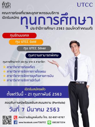 tui sakrapee November 27, 2019 โอกาสสุดท้าย!กว่า40ทุนรัตนมงคล’63 รอบโควต้าคณบดี เรียนป.ตรีม.หอการค้าไทย tui sakrapee November 27, 2019 คณะการท่องเที่ยวและอุตสาหกรรมบริการ มหาวิทยาลัยหอการค้าไทย เปิดรับสมัครทุนการศึกษา ประจำปีการศึกษา 2563 (รอบโควต้าคณบดี) ชิงทุนการศึกษากว่า 40 ทุน จาก 4 สาขาวิชาสุดฮอต – สาขาวิชาการท่องเที่ยว – สาขาวิชาการจัดการการโรงแรม – สาขาวิชาการจัดการธุรกิจสายการบิน – สาขาวิชาการจัดการอีเว้นท์ เปิดรับสมัครตั้งแต่วันนี้ – 21 กุมภาพันธุ์ 2563 สมัครได้ที่ศูนย์รับสมัครนักศึกษาใหม่ อาคาร 24 (ตึกเรือใบ) ชั้น 2 สอบสัมภาษณ์พร้อมนำเสนอแฟ้มสะสมงาน… Continue Reading
