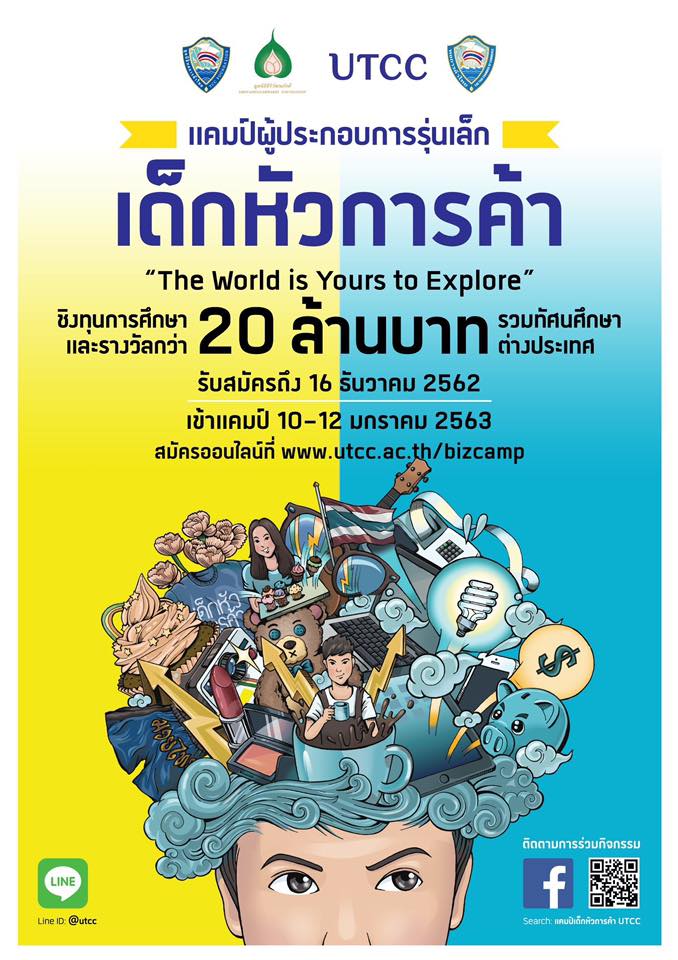 EZ Webmaster December 11, 2019 EZ Webmaster December 11, 2019 ม.หอการค้าเชิญชวนม.ปลายเข้าแคมป์เด็กหัวการค้าปี6ฟรี ชิงทุนการศึกากว่า 20 ล้าน ม.หอการค้าเชิญชวนม.ปลายเข้าแคมป์เด็กหัวการค้าปี6ฟรี ชิงทุนการศึกากว่า 20 ล้าน ในปัจจุบันเศรษฐกิจของไทย รูปแบบการทำธุรกิจและอุตสาหกรรมบริการได้มีการเปลี่ยนแปลงเป็นอย่างมาก มีการนำนวัตกรรมเข้ามาใช้อย่างมาก ทำให้การเจริญเติบโตทางธุรกิจนั้นเริ่มมีความหลากหลายเพิ่มมากขึ้น ทำให้นักเรียนระดับมัธยมศึกษาตอนปลายและนักเรียนระดับสายวิชาชีพได้เป็นผู้ประกอบการหน้าใหม่ที่ประสบความสำเร็จและล้มเหลวทางธุรกิจ จึงเป็นแรงผลักดันที่จะมุ่งสู่นักศึกษาที่เตรียมพร้อมจะเป็นผู้ประกอบการรุ่นใหม่ ในการสร้างตราสินค้า สร้างธุรกิจแนวใหม่ได้ในอนาคต วิทยาลัยผู้ประกอบการ มหาวิทยาลัยหอการค้าไทยร่วมกับหอการค้าไทยจัดโครงการ “แคมป์ผู้ประกอบการรุ่นเล็ก…เด็กหัวการค้า” ปีที่6 ระหว่างวันที่ 10 มกราคม 2563 -12 มกราคม 2563 เพื่อทำตามความฝันของเยาวชนที่จะสร้างความสำเร็จให้กับอาชีพธุรกิจของตนเอง นายภูวเดช นพฤทธิ์ (หมีพู) คณะวิทยาลัยผู้ประกอบการ มหาวิทยาลัยหอการค้าไทย เจ้าของแบรนด์ KAZUN เล่าว่า “ในแคมป์ผู้ประกอบการรุ่นเล็กเด็กหัวการค้าทุกปีจะเน้นสอนกลยุทธ์การทำธุรกิจต่างๆให้นักเรียนมัธยมปลายที่เข้าแคมป์ เราก็ได้ซึมซับจากตรงนั้นมาเพราะมีตอกย้ำการทำธุรกิจในรูปแบบต่างๆโดยเฉพาะออนไลน์ยุคปัจจุบัน ทำให้เราได้ประสบการณ์อย่างมากในการเข้าแคมป์ พอถึงวันหนึ่งที่เราทำธุรกิจจนประสบความสำเร็จในระดับหนึ่งแล้วเราก็ต้องเป็นผู้ให้บ้าง แบรนด์KAZUN เป็นแบรนด์เสื้อผ้าที่ผมออกแบบและผลิตเองซึ่งเป็นเสื้อผ้าแนวสตรีทยอดขายต่อเดือนอยู่ในหลักแสน ปีนี้วันค่ายตรงกับวันที่ 10 มกราคม 2563 -12 มกราคม 2563 อยากเชิญชวนน้องมัธยมปลายเทียบเท่า อายุไม่เกิน 20 ปี บริบูรณ์สมัครเข้าค่ายครั้งนี้กันพร้อมชิงทุนการศึกษากว่า 20 ล้านบาท” คุณสมบัติผู้เข้าสมัครโครงการ“แคมป์ผู้ประกอบการรุ่นเล็ก…เด็กหัวการค้า” ปีที่6 นักเรียนที่กำลังศึกษาในระดับมัธยมศึกษาตอนปลายหรือเทียบเท่า ผู้สมัครต้องมีอายุไม่เกิน 20 ปี บริบูรณ์ สามารถสมัครได้ที่เว็บไซต์โครงการที http://www.utcc.ac.th/bizcamp เลือกกรอกใบสมัครออนไลน์,Facebook :โพสรูปถ่ายที่แสดงความเป็นเด็กหัวการค้า บน Facebook Fanpage “แคมป์เด็กหัวการค้า UTCC”พร้อมแนะนำตัวเอง ชื่อ-นามสกุล ชื่อเล่น ระดับชั้น โรงเรียน ความยาวไม่เกิน 3 บรรทัด รอให้รูปถ่ายของตนเองปรากฏบน Timeline ของ Facebook Fanpage “แคมป์เด็กหัวการค้า UTCC” กด Share โพสท์ตนเองจาก Facebook Fanpage “แคมป์เด็กหัวการค้า UTCC” พร้อมทั้ง Hashtag #แค