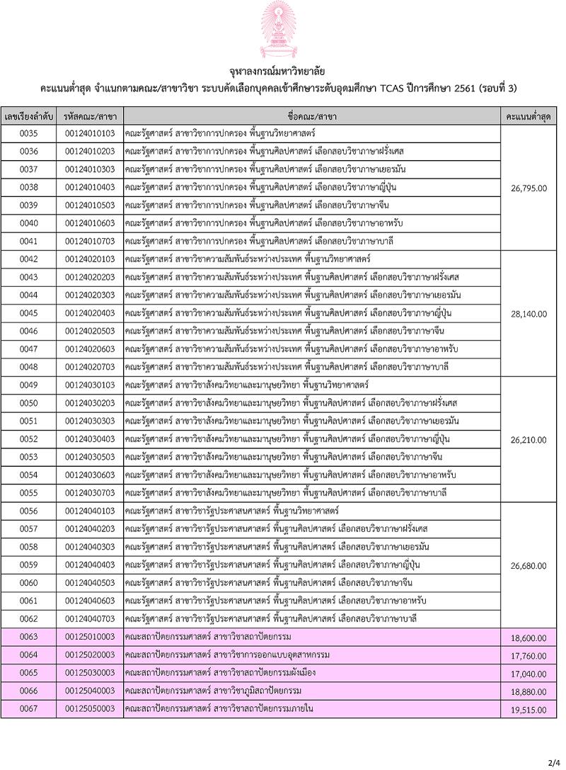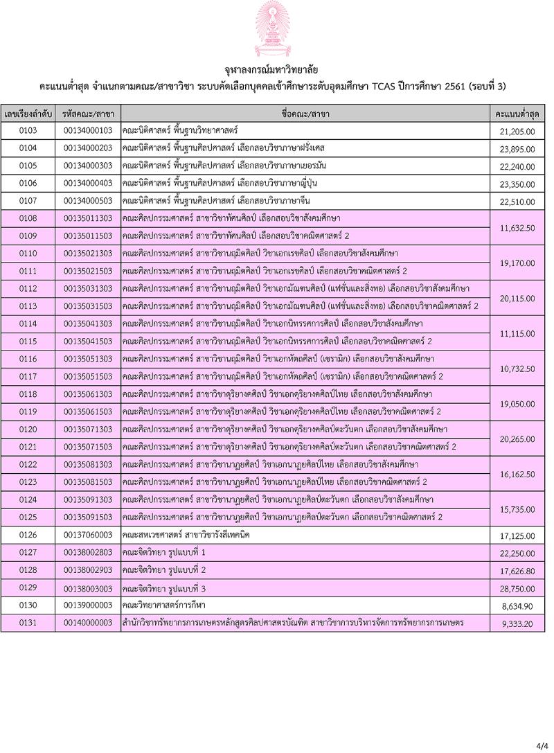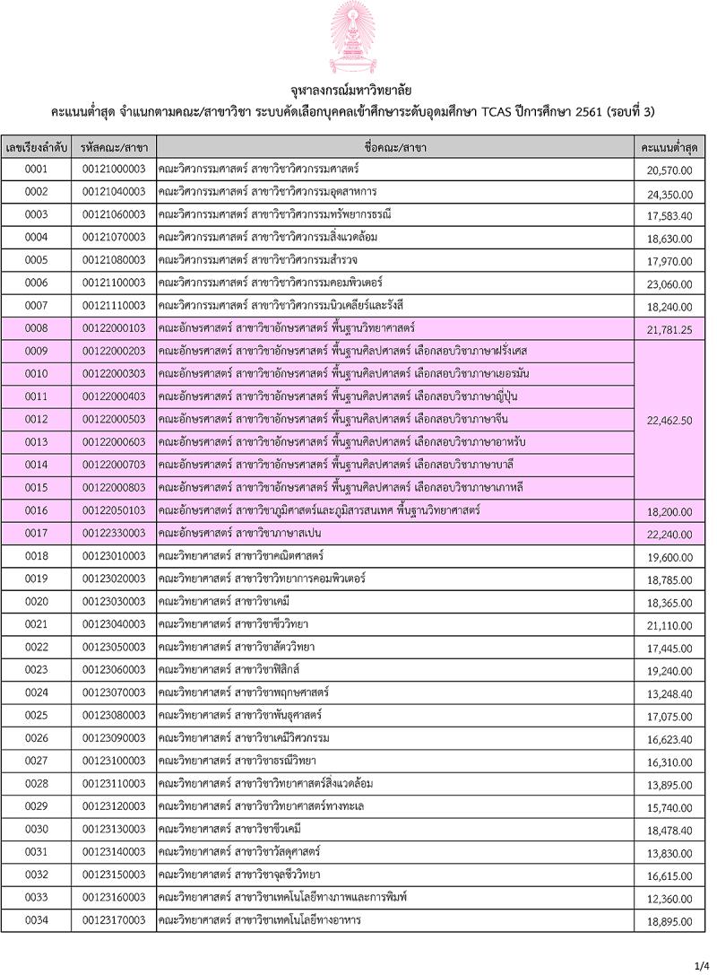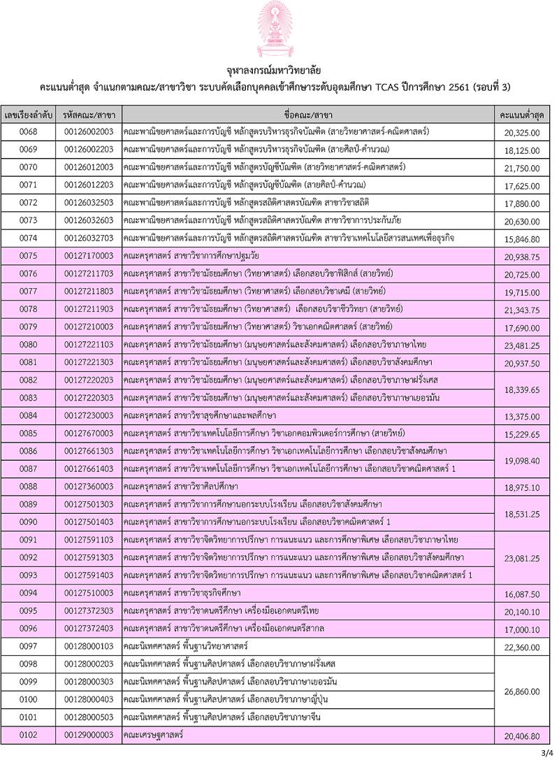EZ Webmaster January 3, 2020 EZ Webmaster January 3, 2020 จุฬาฯ ประกาศคะแนนต่ำสุด TCAS รอบที่ 3 ปี 2561 จุฬาลงกรณ์มหาวิทยาลัย ประกาศคะแนนต่ำสุด จำแนกตามคณะ/สาขาวิชา ระบบคัดเลือกบุคคลเข้าศึกษาระดับอุดมศึกษา TCAS ปีการศึกษา 2561 (รอบที่ 3)