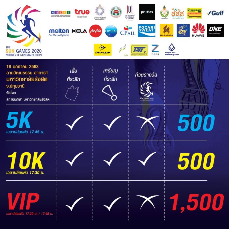 EZ Webmaster January 13, 2020 EZ Webmaster January 13, 2020 ม.รังสิต ชวนวิ่ง “มิดไนท์มินิมาราธอน” งานกีฬามหาวิทยาลัยฯ ครั้งที่ 47 สถาบันกีฬา มหาวิทยาลัยรังสิต จัดกิจกรรม “THE SUN GAMES 2020 MIDNIGHT MINIMARATHON” หนึ่งในกิจกรรมส่งเสริมสุขภาพของการจัดการแข่งขันกีฬามหาวิทยาลัยแห่งประเทศไทยครั้งที่ 47 ซึ่งจัดในวันเสาร์ที่ 18 มกราคม 2563 สถานที่จัดงานมหาวิทยาลัยรังสิต จังหวัดปทุมธานี และเชิญชวนนักเรียน นักศึกษา และผู้ที่สนใจทั่วไป สมัครวิ่งมิดไนท์มินิมาราธอน และร่วมกิจกรรมสนุกๆ กับเหล่าผู้สนับสนุนการจัดงานมากมาย โดยเปิดให้ลงทะเบียนตั้งแต่วันนี้ ถึง 16 มกราคม 2563 สมัครได้ที่ www.fanaticrun.com