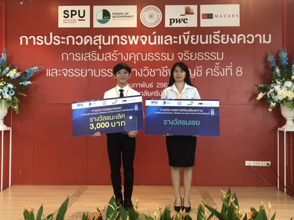 EZ Webmaster February 25, 2020 2 นศ. บัญชี ม.รังสิต คว้ารางวัลชนะเลิศและรางวัลชมเชย การประกวดสุนทรพจน์เเละเรียงความทางวิชาชีพบัญชี (ครั้งที่ 8) EZ Webmaster February 25, 2020 นักศึกษาคณะบัญชี มหาวิทยาลัยรังสิต ได้รับรางวัลชนะเลิศการประกวดสุนทรพจน์ และรางวัลชมเชยการประกวดเรียงความ ในโครงการประกวดสุนทรพจน์และเรียงความ “การเสริมสร้างคุณธรรม จริยธรรม และจรรยาบรรณทางวิชาชีพบัญชี (ครั้งที่ 8) จัดโดย คณะอนุกรรมการสาขาวิชาการบัญชี สมาคมสถาบันอุดมศึกษาเอกชนแห่งประเทศไทย ในพระราชูปถัมภ์ สมเด็จพระเทพรัตนราชสุดาฯ สยามบรมราชกุมารี นายปรมินทร์ งามระเบียบ นักศึกษาชั้นปีที่ 2 คณะบัญชี มหาวิทยาลัยรังสิต ได้รับรางวัลชนะเลิศการประกวดสุนทรพจน์ กล่าวว่า หัวข้อที่ใช้ในการประกวดสุนทรพจน์เกี่ยวกับเรื่องการเสริมสร้างคุณธรรม จริยธรรมและจรรยาบรรณทางวิชาชีพบัญชี โดยในการแข่งขันครั้งนี้มีจำนวนผู้เข้าประกวด 16 คน จาก 16 มหาวิทยาลัยเอกชน ซึ่งในส่วนของการเตรียมตัวนั้นเป็นเรื่องของการเตรียมข้อมูลเนื้อหาสำหรับการแข่งขัน ซึ่งอาจารย์ที่คณะบัญชีที่ได้ให้คำแนะนำที่ดีและตรงประเด็น อีกทั้งยังคอยสอนเทคนิคต่างๆ… Continue Reading