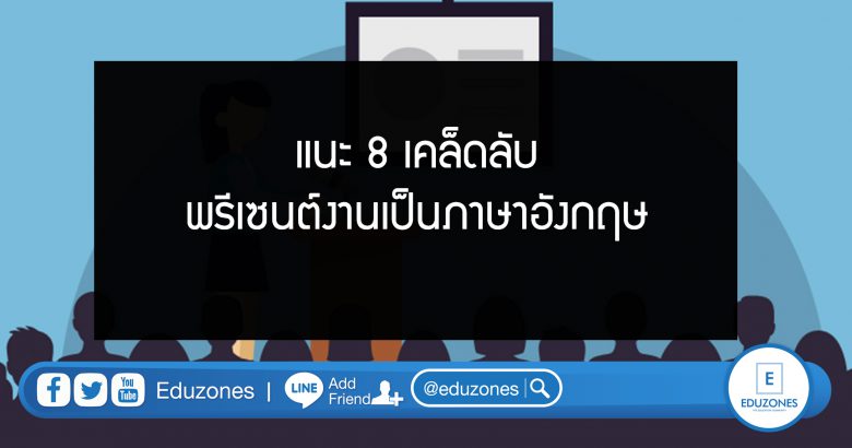 EZ Webmaster February 24, 2020 แนะ 8 เคล็ดลับพรีเซนต์งานเป็นภาษาอังกฤษ EZ Webmaster February 24, 2020 ในปัจจุบันทั้งในการเรียนและการทำงานก็มีการใช้ภาษาอังกฤษที่มากขึ้น ทำให้ทักษะการพูดสื่อสารด้วยภาษาอังกฤษนั้นเป็นสิ่งสำคัญ แต่มากกว่าการสื่อสารด้วยการพูดในการเรียนและการทำงานนั้นคือการต้อง “พรีเซนต์งานเป็นภาษาอังกฤษ” เพราะการนำเสนองานหรือการพูดต่อหน้าคนหลายๆ คนนั้น ต่อให้เป็นคนที่สื่อสารด้วยภาษาอังกฤษเป็นประจำ หรือนักพูดเก่งๆ เองก็ไม่ใช่เรื่องที่ง่าย วันนี้เราจึงมี 8 เคล็ดลับในการพรีเซนต์งานเป็นภาษาอังกฤษให้ดึงดูดคนฟัง และสามารถพรีเซนต์งานได้แบบผ่านฉลุยมาฝากกันค่ะ 1. Do Your Homework ทำการบ้านก่อนการพรีเซนต์ไปให้พร้อม โดยสิ่งที่เราควรจะเตรียมในการเตรียมพรีเซนเทชั่น ได้แก่ – พรีเซนเทชั่นนี้เกี่ยวกับอะไร? และเป้าหมายในการนำเสนอ – ผู้ฟังเป็นแบบไหน? – หาข้อความหลัก หรือประโยคหลัก ของพรีเซนเทชั่น –… Continue Reading