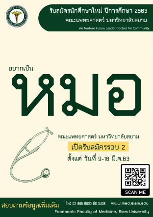EZ Webmaster March 10, 2020 เปิดรับสมัครแล้ว! รับตรง คณะแพทยศาสตร์ ม.สยาม ประจำปีการศึกษา 2563 EZ Webmaster March 10, 2020 คณะแพทย์ ม.สยาม เปิดรับสมัครบุคคลเพื่อสอบคัดเลือกเข้าศึกษาหลักสูตรแพทยศาสตรบัณฑิต ปีการศึกษา 2563 (รอบที่ 2) ระหว่างวันที่ 9 – 18 มีนาคม 2563 โดยเปิดรับสมัคร 2 ช่องทาง คือ – สมัครออนไลน์ทุกวันได้ที่ https://admission.siam.edu/apply/ – สมัครด้วยตนเองได้ที่ ศูนย์รับสมัครนักศึกษา ชั้น 1 อาคารเฉลิมพระเกียรติ 19 มหาวิทยาลัยสยาม ระหว่างเวลา 09.00 – 16.00 น. (ทุกวัน… Continue Reading