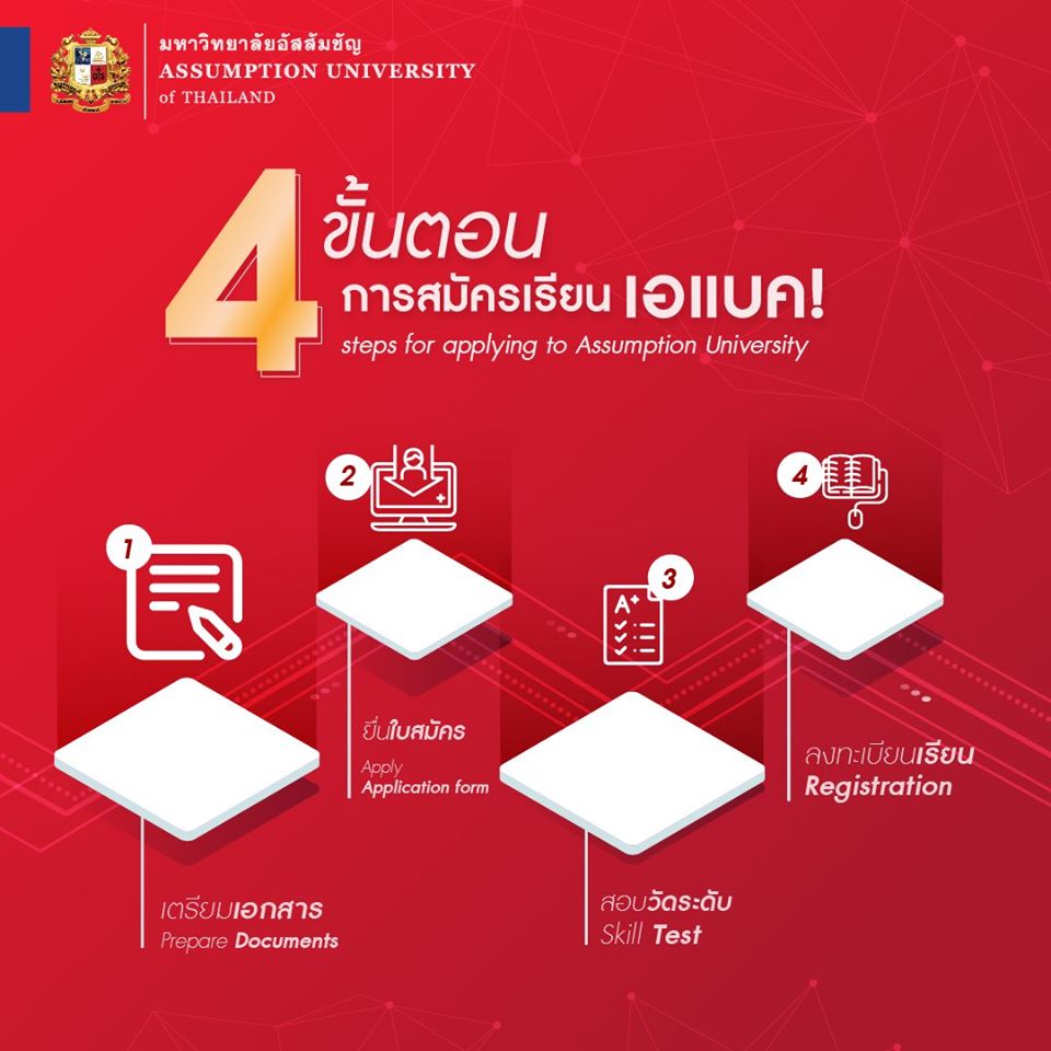 EZ Webmaster April 8, 2020 EZ Webmaster April 8, 2020 แค่ 4 ขั้นตอนง่ายๆ ก็สมัครเรียนปตรี. ที่ ม.อัสสัมชัญได้! มหาวิทยาลัยอัสสัมชัญ เปิดรับสมัครนักศึกษาใหม่ในระดับปริญญาตรี (รอบรับสมัครทั่วไป) ประจำปี 2563 เปิดรับสมัครตั้งแต่วันที่ 30 มีนาคม – 22 เมษายน 2563 ด้วย 4 ขั้นตอนในการสมัคร ได้แก่ ขั้นตอนที่ 1 จัดเตรียมเอกสาร สำหรับเอกสารในการรับสมัครได้แก่ -หลักฐานการศึกษาระดับมัธยมศึกษาตอนปลาย -ผู้ที่กำลังศึกษาในระดับชั้นมัธยมศึกษาตอนปลาย ให้ใช้สำเนาใบ ปพ.1-4 (5 ภาคการศึกษา) -ผู้สำเร็จการศึกษาระดับมัธยมศึกษาตอนปลายแล้ว ให้ใช้สำเนาใบ ปพ. 1-4 (6 ภาคการศึกษา) และสำเนาใบประกาศนียบัตร ที่กระทรวงศึกษาธิการรับรอง -ผู้ที่สำเร็จการศึกษาจากต่างประเทศ ให้ใช้ใบแสดงผลการศึกษา และใบประกาศนียบัตร หรือประกาศนียบัตรอื่นๆ ที่กระทรวงศึกษาธิการรับรองและเทียบเท่าหลักสูตรมัธยมศึกษาตอนปลาย -รูปถ่ายหน้าตรง ขนาด 3 x 4 ซ.ม. จำนวน 1 รูป -สำเนาทะเบียนบ้าน จำนวน 1 ฉบับ -สำเนาบัตรประจำตัวประชาชน จำนวน 1 ฉบับ -หลักฐานอื่นๆ (ถ้ามี) เช่น หลักฐานการเปลี่ยนชื่อ-ชื่อสกุล จำนวน 1 ฉบับ ขั้นตอนที่ 2 ยื่นใบสมัคร โดยสามารถยื่นใบสมัครได้ 2 วิธี ได้แก่ -สมัครด้วยตัวเองที่มหาวิทยาลัย -สมัครผ่าน www.applicationonline.au.edu / E-Mail : abac@au.edu ขั้นตอนที่ 3 สอบวัดระดับความสามารถ – เพื่อเตรียมความพร้อมก่อนเข้ามหาวิทยาลัยโดยสอบวิชาภาษาอังกฤษและคณิตศาสตร์ (บางคณะ) ขั้นตอนที่ 4 ลงทะเบียนเรียน – เริ่มต้นลงทะเบียนเรียนพร้อมชำระค่าธรรมเนียม สำหรับวิชาปรับพื้นฐานก่อนเริ่มเรียนหลักสูตรจริง สำหรับคุณสมบัติของผู้สมัคร (ทั่วไป) ได้แก่ -เป็นผู้สำเร็จการศึกษามัธยมศึกษาตอนปลาย หรือเทียบเท่า -ได้คะแนนเฉลี่ยตั้งแต่ 2.50 ขึ้นไป -เข้ารับการทดสอบเพื่อวัดระดับความรู้พื้นฐานทางภาษาอังกฤษในวันที่สมัครเข้าศึกษา (สอบวิชาเฉพาะทางออนไลน์ สำหรับคณะพยาบาลศาสตร์ คณะดนตรี คณะนิเทศศาสตร์ คณะนิเทศศิลป์ และคณะนิติศาสตร์) -เป็นผู้มีความประพฤติเรียบร้อย *สำหรับคุณสมบัติเพิ่มเติมของบางคณะ สามารถดูรายละเอียดเพิ่มเติมได้ที่ >>> https://registrar.au.edu/th/%E0%B8%99%E0%B8%B1%E0%B8%81%E0%B8%A8%E0%B8%B6%E0%B8%81%E0%B8%A9%E0%B8%B2%E0%B8%A0%E0%B8%B2%E0%B8%84%E0%B8%A0%E0%B8%B2%E0%B8%A9%E0%B8%B2%E0%B9%84%E0%B8%97%E0%B8%A2/ ดูรายละเอียดการสมัครเข้าศึกษาของมหาวิทยาลัยอัสสัมชัญเพิ่มเติม ได้ที่ https://registrar.au.edu/th/