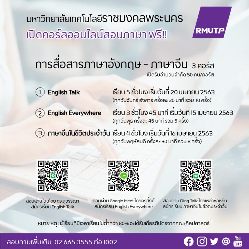 มหาวิทยาลัยเทคโนโลยีราชมงคลพระนคร เปิดอบรมหลักสูตรระยะสั้นด้านภาษาต่างประเทศ (อังกฤษ – จีน) ฟรีไม่เสียค่าใช้จ่าย โดยอาจารย์ผู้เชี่ยวชาญ จากคณะศิลปศาสตร์ ซึ่งเปิดการเรียนการสอนผ่านระบบออนไลน์ จำนวน 3 หลักสูตร ได้แก่ 1.ภาษาอังกฤษ “English Talk” เรียนทุกวันจันทร์ อังคาร เสริมทักษะด้านการพูดภาษาอังกฤษที่เกี่ยวข้องกับสถานการณ์ปัจจุบัน 2.ภาษาอังกฤษ “English Everywhere” เรียนทุกวันพุธ เสริมทักษะการอ่านและการแปลเนื้อหาในสื่อออนไลน์ ข่าว หนัง คอมเมนต์ คำศัพท์แสลง และ 3.คอร์สภาษาจีน “ภาษาจีนในชีวิตประจำวัน” เรียนกับเจ้าของภาษาโดยตรงทุกวันพฤหัสบดี ด้านการออกเสียงคำศัพท์ ความรู้วัฒนธรรมจีน บทสนทนาพื้นฐานที่ใช้ได้จริงในชีวิตประจำวัน แต่ละหลักสูตรรับจำนวนจำกัดไม่เกิน 50 คน หากผู้เรียนที่เข้าเรียนไม่ต่ำกว่า 80% จะได้รับเกียรติบัตรจากทางคณะอีกด้วย ซึ่งการจัดหลักสูตรครั้งนี้เพื่อส่งเสริมการพัฒนาทักษะด้านภาษาและสร้างอาชีพใหม่ ให้กับเยาวชนและประชาชนทั่วไปได้รับผลกระทบจากโควิด -19 อย่างไรก็ตามผู้สนใจสามารถสมัครผ่านระบบออนไลน์ที่ QR code ตั้งแต่บัดนี้เป็นต้นไป สอบถามรายละเอียดเพิ่มเติมฝ่ายวิชาการและวิจัย คณะศิลปศาสตร์ โทร 02 665 3555 ต่อ 1002 หรือ ID Line : yutthapoom.s5335