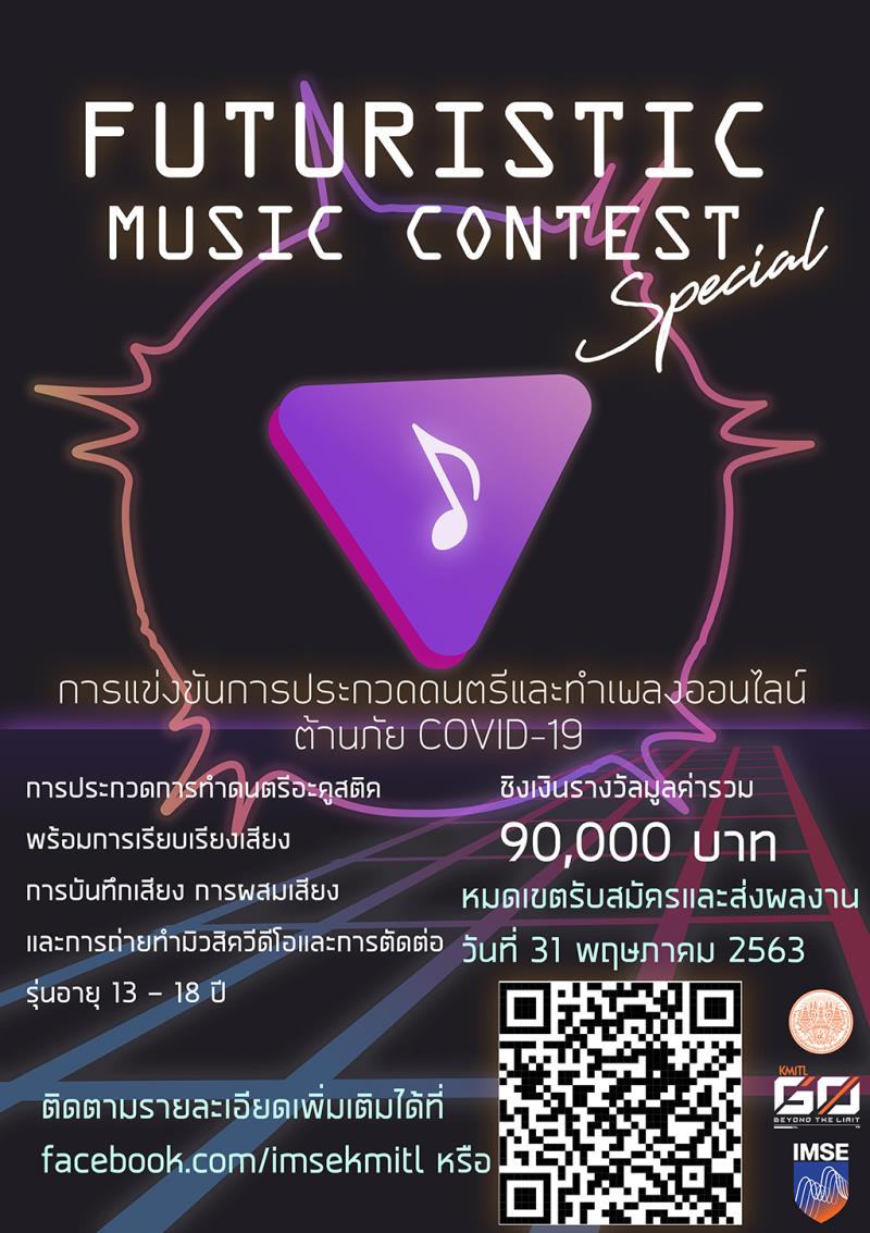วิทยาลัยวิศวกรรมสังคีต สถาบันเทคโนโลยีพระจอมเกล้าเจ้าคุณทหารลาดกระบัง (สจล.) เชิญชวนเยาวชนอายุตั้งแต่ 13-18 ปี ที่มีใจรักดนตรี เข้าร่วมประกวดทำเพลงออนไลน์ ในโครงการ “Futuristic Music Contest” ทั้งประเภทศิลปินเดี่ยว และประเภทวงดนตรี ภายใต้แนวคิดการสร้างสรรค์ดนตรีด้วยเทคโนโลยีไร้พรหมแดน ห่างไกลโควิด-19 โดยผู้เข้าร่วมประกวดจะต้องส่งคลิปวีดีโอ ที่ทำดนตรีแนวอะคูสติคแบบครบวงจร ตั้งแต่การเล่นดนตรี การเรียบเรียงดนตรี การบันทึกเสียง การผสมเสียง และการถ่ายทำภาพวิดีตัดต่อ ผู้ได้รับการคัดเลือกจะได้ร่วมงานกับ วิทยาลัยวิศวกรรมสังคีต รวมถึงสนับสนุนการทำเพลงเป็นของตัวเอง หากงานเพลงมีคุณภาพเหมาะสมตามการพิจารณาของวิทยาลัย พร้อมลุ้นรับเงินรางวัลรวมมูลค่า 90,000 บาท