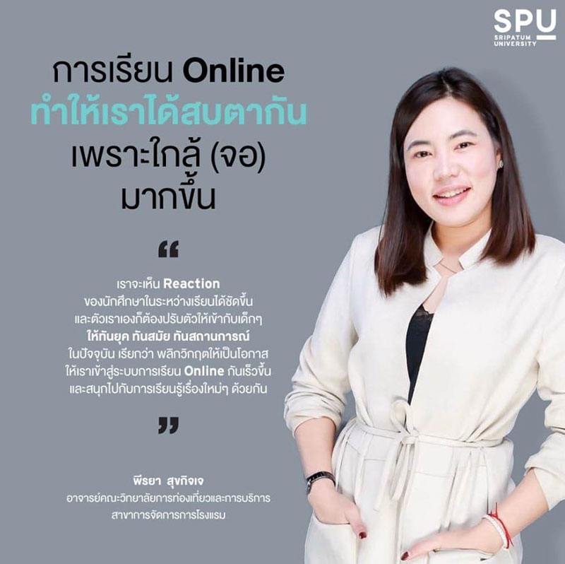 EZ Webmaster April 28, 2020 EZ Webmaster April 28, 2020 รู้หรือไม่! วิชาปฏิบัติการ การโรงแรม….ใครว่าเรียน Online ไม่ได้ วิชาปฏิบัติการ….ใครว่าเรียน Online ไม่ได้ เปลี่ยนวิกฤติให้เป็นโอกาส กับวิทยาลัยการท่องเที่ยวและการบริการ ม.ศรีปทุม มีคนหลายคนเคยบอกว่าวิชาที่ต้องลงมือ “ปฏิบัติ” กับการเรียน “Online” ฟังดูเหมือนจะไปกันไม่ได้ แต่…ที่ SPU เราทำได้ “อยู่ตำแหน่งไหนบนโลก..ก็เรียนได้” “โควิด – 19” ผลกระทบที่ต้องหันมา “เรียนออนไลน์” ภายใต้ข้อจำกัดหลายๆ อย่าง ทั้งความพร้อมของอุปกรณ์ โปรแกรม สัญญาณอินเทอร์เน็ต รวมไปถึงผู้เรียนและผู้สอน ที่ต้องปรับตัวรับมือครั้งใหญ่ และดูเหมือนวิชาที่ต้องทำการปฏิบัติ (ลงมือทำ) กับการเรียน “ออนไลน์” มันจะไปกันไม่ได้ ในความคิดของหลายๆ คน แต่กับ อาจารย์พีรยา สุขกิจเจ หัวหน้าสาขาวิชาการจัดการการโรงแรม วิทยาลัยการท่องเที่ยวและการบริการ มหาวิทยาลัยศรีปทุม หรือ “โค้ชพี่พี” ของน้องๆนั้นบอกว่า…..มันง่ายนิดเดียว!! ห้องเรียนในบ้าน กับการสอน “ออนไลน์” ในรูปแบบของ “อาจารย์” โค้ชพี่พี เล่าว่า หลายคนอาจสงสัยว่า อาจารย์จะสอนยังไง มันทำได้เหรอ แน่นอนว่ามันทำได้ โดยอาจารย์จะเป็นผู้ทำการสาธิตและเปิดโอกาสให้นักศึกษาซักถาม พูดคุยระหว่างการเรียน โดยหลังจากนั้นจะให้นักศึกษา ทำคลิป VDO ที่บ้านของนักศึกษาเองเพื่อความปลอดภัยในช่วงนี้ และนำเสนอผ่านออนไลน์ภายหลัง เช่น วิชาครัว จะให้นักศึกษาออกแบบเมนูอาหารตามหัวข้อที่กำหนดไว้ เตรียมทำคลิป VDO นำเสนอ และที่สำคัญที่สุด เป็นการส่งเสริมให้นักศึกษาใช้เวลากับครอบครัวในการทำกิจกรรมอยู่ที่บ้านอีกด้วย สำหรับ วิชาบาร์ อาจารย์จะทำการสาธิต พร้อมทั้งให้นักศึกษาได้ลงมือทำอยู่ที่บ้าน และสามารถขอคำแนะนำจากอาจารย์ได้ตลอดเวลา ผ่านทางออนไลน์ ก่อนที่จะทำชิ้นงานส่ง “ออนไลน์“ ย่นระยะทาง ให้ได้สบตา เพราะเราใกล้ (จอ) กัน โค้ชพี่พี เล่าต่อว่า หากคิดในแง่บวก การเรียนการสอนออนไลน์ มันทำให้เราได้สบตากันมากขึ้น เพราะใกล้ (จอ) กันมาก เราจะเห็น Reaction ของนักศึกษาในระหว่างเรียน ขอย้อนกลับไปเมื่อตอนต้นเทอมนะคะ พีมีสอนคาบเรียน 09.00 น. เราเองก็อยากรู้ว่าเด็กๆ มาเรียนกันยังไง ตื่นกี่โมง วันนี้รถติดไหม บ้านอยู่ที่ไหน คุยเรื่องราวข่าวสารเหมือนพูดคุยกันคล้าย homeroom ทีนี้พอมาถึงตอนเช็คชื่อเข้าห้องเรียน จะต้องทำการเรียกชื่อแต่ละคน มันเป็นอะไรที่ค่อนข้างยาก เพราะเด็กๆ เดี๋ยวนี้ชื่ออ่านยากมากค่ะ เช่น อภิรัฐฐา สรรรฑทัศน์ อ่านยากมาก!! พีเลยให้ช่วยกันตั้งชื่อนามปากกา เช่น เจนนี่ คลองเจ็ด, บอล สะพานใหม่, มิ้ล สามเหลี่ยมดินแดง, 