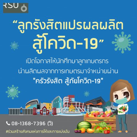 EZ Webmaster April 27, 2020 ม.รังสิต ตั้งโครงการ “ลูกรังสิตแปรผลผลิตสู้โควิด-19” ช่วยเหลือเกษตรกร EZ Webmaster April 27, 2020 มหาวิทยาลัยรังสิต ส่งต่อความห่วงใย ช่วยเหลือนักศึกษาที่ครอบครัวประกอบอาชีพด้านเกษตรกรรม และได้รับผลกระทบจากวิกฤตโควิด-19 จัดตั้งโครงการ “ลูกรังสิตแปรผลผลิตสู้โควิด-19” โดยมหาวิทยาลัยจะรับซื้อผลผลิตทางการเกษตรต่างๆ เช่น ผัก ผลไม้ เพื่อนำมาใช้ในการแปรรูปเป็นอาหารผ่าน “ครัวรังสิต สู้ภัยโควิด-19” เพื่อแจกจ่ายให้กับประชาชนที่เดือดร้อนจากผลกระทบ ตลอดโครงการตั้งแต่วันที่ 22 เม.ย. – 31 พ.ค. 2563 ทั้งนี้ นักศึกษาสามารถนำผลผลิตจากการเกษตรที่มีจำนวนมาก และไม่สามารถหาช่องทางในการจำหน่ายได้ มาจำหน่ายให้กับมหาวิทยาลัยรังสิต โดยส่งมอบตามวันเวลา และสถานที่ที่กำหนด โดยติดต่อประสานงานได้ที่ โทร. 08-1368-7396 (วิ) Continue Reading