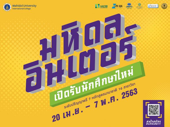 tui sakrapee April 24, 2020 มหิดลอินเตอร์ เปิดรับนักศึกษาใหม่ระดับปริญญาตรี tui sakrapee April 24, 2020 วิทยาลัยนานาชาติ มหาวิทยาลัยมหิดล (MUIC) เปิดรับสมัครนักศึกษาใหม่ระดับปริญญาตรี หลักสูตรนานาชาติ รอบที่ 1 ประจำปีการศึกษา 2563-2564 จำนวน 7 หลักสูตร 16 สาขาวิชา ระหว่างวันที่ 20 เมษายน – 7 พฤษภาคม 2563 โดยมีรายละเอียดดังนี้ หลักสูตรนิเทศศาสตร์บัณฑิต (BACHELOR OF COMMUNICATION ARTS : B.COM.ARTS) – สาขาวิชาสื่อและการสื่อสาร (Media and Communication)… Continue Reading