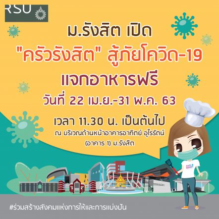EZ Webmaster April 24, 2020 ม.รังสิต เปิด “ครัวรังสิต เพื่อประชาชน… รวมใจสู้ภัย COVID-19” EZ Webmaster April 24, 2020 มหาวิทยาลัยรังสิต จัดตั้ง “ครัวรังสิต สู้ภัย COVID-19” เพื่อทำอาหารแจกให้แก่นักศึกษา และบุคคลทั่วไปที่ได้รับผลกระทบจาก COVID-19 เพื่อเป็นส่วนหนึ่งในการแบ่งเบาความทุกข์ของประชาชน และร่วมสร้างสังคมแห่งการให้และการแบ่งปัน โดยขอความร่วมมือทุกท่านที่เข้ามารับอาหารปฏิบัติตามขั้นตอนต่างๆ ตามมาตรการคัดกรองและป้องกันของมหาวิทยาลัย และใส่หน้ากากอนามัย เริ่มตั้งแต่วันที่ 22 เมษายน – วันที่ 31 พฤษภาคม 2563 ณ บริเวณด้านหน้าอาคารอาทิตย์ อุไรรัตน์ (อาคาร 1) มหาวิทยาลัยรังสิต สำหรับจิตอาสา บุคคล หน่วยงานที่สนใจร่วมเป็นเจ้าภาพในการจัดทำอาหาร สมทบทุน หรือประสงค์จะมอบข้าวสาร อาหารแห้ง เจลแอลกอฮอล์ สามารถติดต่อประสานงานได้ที่ โทร. 08-1368-7396 (วิ) Continue Reading