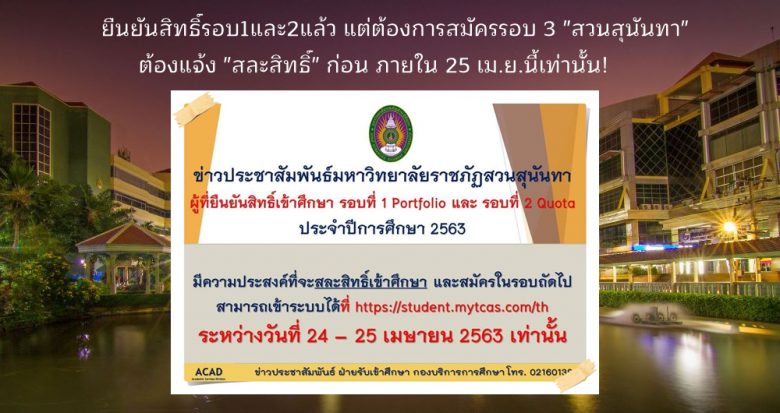 tui sakrapee April 24, 2020 ยืนยันสิทธิ์รอบ1และ2แล้ว แต่ต้องการสมัครรอบ 3 “สวนสุนันทา” ต้องแจ้ง “สละสิทธิ์”ภายใน 25 เม.ย.นี้เท่านั้น! tui sakrapee April 24, 2020 cแจ้งถึงนักเรียนที่ได้ยืนยันสิทธิ์เข้าศึกษา รอบที่ 1 Portfolio และ รอบที่ 2 Quota ประจำปีการศึกษา 2563 แต่ต้องการ “สละสิทธิ์” ให้เข้าไปยืนยันในระบบถึงวันที่ 25 เมษายนนี้ หลังจากนั้นสามารถสมัครรอบที่ 3 ที่ “สวนสุนันทา” ได้ตั้งแต่บัดนี้เป็นต้นไป ต้องการสละสิทธิ์ต้องแจ้ง 24-25 เม.ย.นี้เท่านั้น!! ผู้ที่ยืนยันสิทธิ์เข้าศึกษา รอบที่ 1 Portfolio และ รอบที่ 2 Quota ประจำปีการศึกษา… Continue Reading