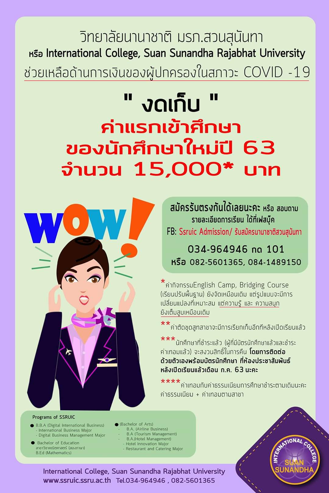 EZ Webmaster May 9, 2020 EZ Webmaster May 9, 2020 ข่าวดี! สำหรับน้องๆที่จะเข้าเรียนปี 63 นานาชาติ สวนสุนันทา ประกาศงดเก็บค่าแรกเข้าสำหรับนักศึกษาใหม่ปี 63 วิทยาลัยนานาชาติ ม.ราชภัฏสวนสุนันทา (International College, Suan Sunandha Rajabhat University) ประกาศงดเก็บค่าแรกเข้าสำหรับนักศึกษาใหม่ปี 63 เพื่อเป็นการลดค่าใช้จ่ายให้กับผู้ปกครองช่วงสภาวะ COVID-19 เป็นเงิน 15,000 บาท (ค่ากิจกรรมอิงลิชแคมป์ ค่าเรียนปรับพื้นฐาน กิจกรรมต่างๆ ทั้งนี้จะยังจัดให้เหมือนเดิม สนุกเหมือนเดิม ปรับเปลี่ยนรูปแบบไปบ้าง เท่ากับน้องๆเรียนปรับพื้นฐานฟรี อิงลิชแคมป์ฟรี กันเลยทีเดียว) น้องๆ แค่เสียค่าธรรมเนียมการศึกษาตลอดการศึกษา ไม่เกิน 5,000 บาท(โดยประมาณ) + ค่าเทอมตามสาขา รีบสมัครและรับสิทธิ์ทันที ได้ที่ shorturl.at/jswO3 #dek63 #SSRUIC