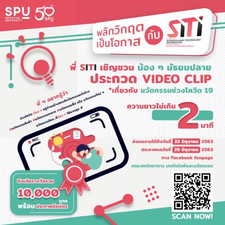 EZ Webmaster May 26, 2020 ห้ามพลาด! SITI SPU ขอเชิญน้องๆมัธยมปลาย ร่วมประกวด Video Clip นวัตกรรมช่วงโควิด-19 ชิงเงินรางวัลรวมกว่า 10,000 บาท EZ Webmaster May 26, 2020 คณะสหวิทยาการ เทคโนโลยีและนวัตกรรม มหาวิทยาลัยศรีปทุม ขอเชิญชวนน้องๆ มัธยมศึกษาตอนปลาย ที่มีความคิดสร้างสรรค์ ส่งผลงานเข้าร่วมประกวด VIDEO CLIP *Clip เกี่ยวกับ นวัตกรรมช่วงโควิด-19 หรือ clip พิชิต COVID-19 ความยาวไม่เกิน 2 นาที ส่งผลงานได้ถึงวันที่ 22 มิถุนายน 2563 ประกาศผลวันที่ 29 มิถุนายน 2563 ทางเฟสบุ๊คแฟนเพจ คณะสหวิทยาการ เทคโนโลยีและนวัตกรรม มาร่วมสนุกกันในกิจกรรม ประกวด Video Clip** *ด้านนวัตกรรม #นวัตกรรมสินค้า #นวัตกรรมอาหาร #นวัตกรรมสื่อ หรือนวัตกรรมใหม่ๆ นวัตกรรมไหน…ที่น้องๆใช้มากสุด… 😛 วิธีการส่งผลงาน… ผลงานที่ส่งเข้าประกวดต้องเป็นการสร้างสรรค์clip… Continue Reading