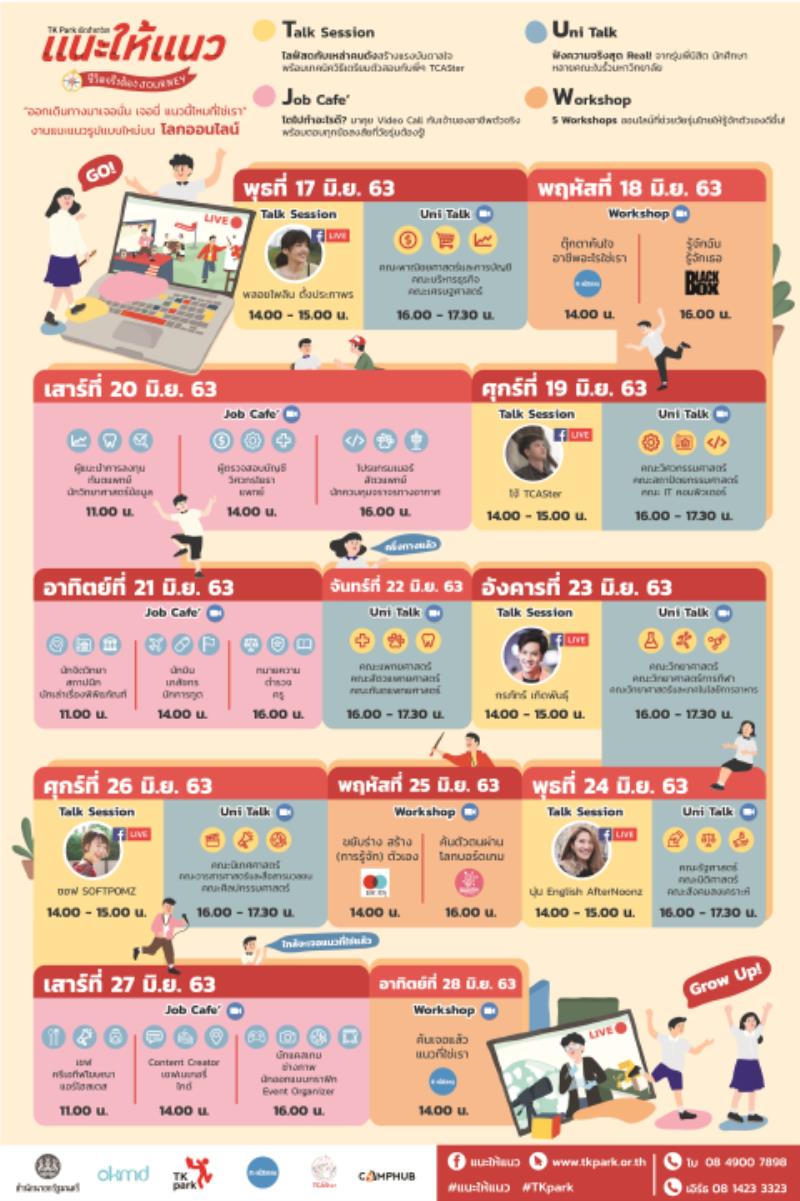 สำหรับน้องๆ ที่สนใจข้อมูลทางด้านอาชีพ ยังสามารถเข้าไปชมนิทรรศการแนะให้แนวออนไลน์ที่จะรวบรวมข้อมูลอาชีพที่หลากหลายไว้ให้น้องๆ  เข้าใจได้อย่างง่ายๆ เพียงคลิกเข้าไปดาวน์โหลดข้อมูลนิทรรศการออนไลน์ได้ฟรีที่ www.tkpark.or.th (ตั้งแต่วันที่ 8 กรกฎาคม 2563 เป็นต้นไป)