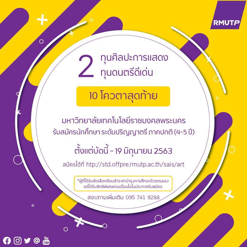 EZ Webmaster June 16, 2020 EZ Webmaster June 16, 2020 มทร.พระนคร รับนักศึกษา TCAS 5 พร้อมอัดฉีดทุนเรียนฟรี ผู้มีความสามารถด้านศิลปะการแสดง -ดนตรี รศ.สุภัทรา โกไศยกานนท์ รักษาราชการแทนอธิการบดี มหาวิทยาลัยเทคโนโลยีราชมงคลพระนคร เปิดเผยว่า มหาวิทยาลัยกำลังเปิดรับนักศึกษาระดับชั้นมัธยมศึกษาปีที่ 6 เข้าศึกษาต่อระดับปริญญาตรี ระบบทีแคส (TCAS) รอบที่ 5 การรับตรงอิสระ ประจำปีการศึกษา 2563 เป็นรอบสุดท้าย เพื่อเข้าศึกษาต่อใน 8 คณะ ได้แก่ คณะศิลปศาสตร์ คณะวิทยาศาสตร์และเทคโนโลยี คณะบริหารธุรกิจ คณะวิศวกรรมศาสตร์ คณะอุตสาหกรรมสิ่งทอและออกแบบแฟชั่น คณะเทคโนโลยีคหกรรมศาสตร์ คณะเทคโนโลยีสื่อสารมวลชน และคณะสถาปัตยกรรมศาสตร์และการออกแบบ เปิดรับสมัครตั้งแต่บัดนี้ – วันที่ 22 มิถุนายน 2563 โดยรับสมัครทางเว็บไซต์ www.rmutp.ac.th เข้าสู่เมนูรับสมัครนักศึกษา สอบถามรายละเอียดเพิ่มเติมที่สำนักส่งเสริมวิชาการและงานทะเบียน (สวท.) ราชมงคลพระนคร โทรศัพท์ 0-2665-3777 ต่อ 6305 6409 และ 6636 รศ.สุภัทรา โกไศยกานนท์ กล่าวต่อว่า นอกจากนี้มหาวิทยาลัยได้จัดสรรทุนการศึกษาในระบบโควตาพิเศษ จำนวน 10 ทุน ซึ่งเป็นทุนการศึกษาให้เปล่า โดยไม่มีข้อผูกมัด ตลอดหลักสูตร (4-5 ปี) ให้กับนักศึกษาที่มีความสามารถด้านศิลปะการแสดง นาฏศิลป์ไทย สากล ประยุกต์ และหรือด้านดนตรี ขับร้อง ทั้งไทย สากล ลูกท่ง ลูกกรุง ดีเด่น สำหรับนักศึกษาที่สนใจต้องรวบรวมและจัดทำแฟ้มประวัติ ผลงาน และความสามารถ (CV, Comcard, Portfolio) เพื่อใช้ในการสมัครตั้งแต่บัดนี้ – 19 มิถุนายน 2563 สอบถามรายละเอียดเพิ่มเติมได้ที่เว็บไซต์ กองพัฒนานักศึกษา http://std.offpre.rmutp.ac.th โทรศัพท์ 095-741-9283