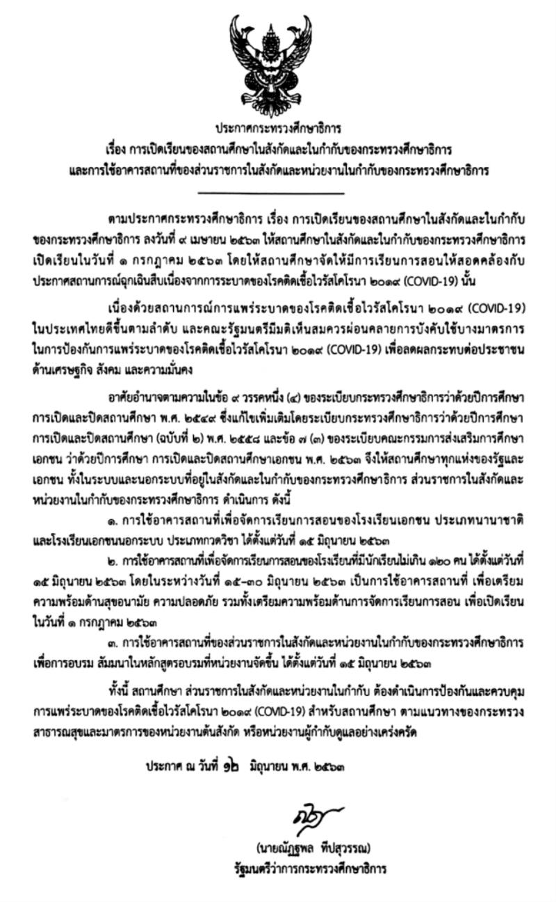 EZ Webmaster June 17, 2020 EZ Webmaster June 17, 2020 กระทรวงศึกษาธิการออกประกาศเปิดเรียน และแนวทางการใช้อาคารสถานที่ รัฐมนตรีว่าการกระทรวงศึกษาธิการ นายณัฏฐพล ทีปสุวรรณ ได้ลงนามในประกาศกระทรวงศึกษาธิการ ลงวันที่ 12 มิถุนายน 2563 เรื่อง การเปิดเรียนของสถานศึกษาในสังกัดและในกำกับของกระทรวงศึกษาธิการ และการใช้อาคารสถานที่ของส่วนราชการในสังกัดและหน่วยงานในกำกับของกระทรวงศึกษาธิการ -โดยสำหรับการใช้อาคารสถานที่เพื่อจัดการเรียนการสอนของโรงเรียนเอกชนประเภทนานาชาติ และโรงเรียนกวดวิชา ให้เริ่มใช้ได้ตั้งแต่วันที่ 15 มิถุนายน 2563 -การใช้อาคารสถานที่เพื่อจัดการเรียนการสอนของโรงเรียนที่มีนักเรียนไม่เกิน 120 คน ได้ตั้งแต่วันที่ 15 มิถุนายน 2563 โดยในระหว่างวันที่ 15-30 มิถุนายน 2563 เป็นการใช้อาคารสถานที่เพื่อเตรียมความพร้อมด้านสุขอนามัย ความปลอดภัย รวมทั้งเตรียมความพร้อมด้านการจัดการเรียนการสอน เพื่อเปิดเรียนในวันที่ 1 กรกฎาคม 2563 -การใช้อาคารสถานที่ของส่วนราชการในสังกัดและหน่วยงานในกำกับของกระทรวงศึกษาธิการ เพื่อการอบรม สัมมนาในหลักสูตรอบรมที่หน่วยงานจัดขึ้น ได้ตั้งแต่วันที่ 15 มิถุนายน 2563 โดยต้องดำเนินการป้องกันและควบคุมการแพร่ระบาดของโรคโควิด-19 ตามแนวทางของกระทรวงสาธารณสุข และมาตรการของหน่วยงานต้นสังกัด หรือหน่วยงานผู้กำกับดูแลอย่างเคร่งครัด ขอบคุณข้อมูลจาก -https://moe360.blog