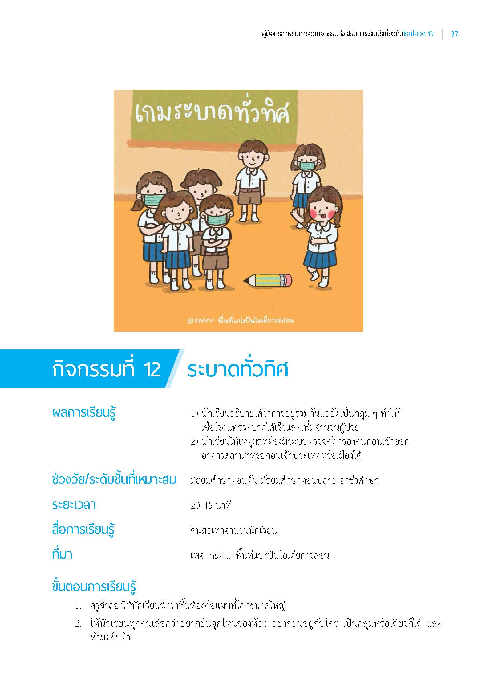 EZ Webmaster July 13, 2020 EZ Webmaster July 13, 2020 ดาวน์โหลดเลย! “คู่มือครูสําหรับการจัดกิจกรรมส่งเสริมการเรียนรู้เกี่ยวกับโรคโควิด-19” จากยูนิเซฟ ด้วยสถานการณ์การแพร่ระบาดของโรคโควิด-19 (COVID-19) ที่ทั่วโลกต้องเผชิญอยู่นั้น ทำให้หน่วยงานต่าง ๆ ในประเทศไทยและประชาชนทุกคนต้องดำเนินการตามมาตรการต่างๆ เพื่อป้องกันการแพร่เชื้อ ลดผลกระทบของการระบาดที่มีต่อสังคม ในทุกระดับไม่ให้แพร่กระจายออกไป ดังนั้นเพื่อให้ทั้งหน่วยงานต่างๆ และภาคประชาชนสามารถดำเนินมาตรการการป้องการแพร่เชื้อให้ได้อย่างถูกต้อง การเผยแพร่ความรู้เกี่ยวกับโควิท-19 จึงเป็นอีกเรื่องที่สำคัญ โดยเฉพาะสถานศึกษา ที่เป็นสถาบันทางสังคมที่มีบทบาทอย่างมากในการสร้างสภาพแวดล้อมทางการศึกษาที่ปลอดภัยมีมาตรการป้องกันการแพร่ระบาดของโรค รวมถึงเป็นที่ให้ความรู้ความเข้าใจเกี่ยวกับโรคโควิด-19 และแนวปฏิบัติเพื่อการดูแลสุขภาพอนามัย เพื่อคุ้มครองนักเรียนและนักศึกษาให้ได้รับข้อมูลที่ถูกต้อง ดังนั้นเพื่อเป็นการเผยแพร่ความรู้เกี่ยวกับไวรัสดังกล่าวอย่างถูกต้อง ทางองค์การยูนิเซฟ ประเทศไทย จึงร่วมกับสำนักงานปลัดกระทรวงศึกษาธิการและสำนักงานคณะกรรมการการศึกษาขั้นพื้นฐาน กระทรวงศึกษาธิการ จัดทำคู่มือครูสำหรับการจัดกิจกรรมส่งเสริมการเรียนรู้เกี่ยวกับโรคโควิด-19 (COVID-19) ขึ้น เพื่อให้ครูสามารถจัดกิจกรรมที่ส่งเสริมการเรียนรู้ของนักเรียนเกี่ยวกับโรคโควิด-19 ได้อย่างรอบด้าน ซึ่งนอกจากจะช่วยให้นักเรียนเข้าใจเกี่ยวกับโรค วิธีการดูแลตัวเองและการป้องกันการแพร่ระบาดได้อย่างถูกต้องปลอดภัยแล้ว ยังจะช่วยให้นักเรียนเข้าใจถึงประเด็นอื่น ๆ ที่สำคัญเกี่ยวกับโควิท-19 ได้อีกด้วย โดยเนื้อหาภายในคู่มือจะแบ่งเป็น 2 ส่วน ได้แก่ ส่วนที่หนึ่ง เป็นการอธิบายการนำกิจกรรมไปใช้ตามพัฒนาการและการเรียนรู้ในแต่ละช่วงวัย/ระดับชั้นของนักเรียน และส่วนที่สอง เป็นกิจกรรมการเรียนรู้สำหรับเด็ก นักเรียน นักศึกษา ในช่วงวัย/ระดับชั้นต่าง ๆ โดยบุคลากรทางการศึกษาเพื่อให้สามารถนำไปประยุกต์ใช้กับผู้เรียนได้อย่างถูกต้องเหมาะสมนั่นเอง ตัวอย่างเนื้อหา สำหรับครู รวมถึงบุคากรทางการศึกษาท่านใดที่ต้องการศึกษาคู่มือครูสำหรับการจัดกิจกรรมส่งเสริมการเรียนรู้เกี่ยวกับโรคโควิด-19 (COVID-19) เพิ่มเติมก็สามารถเข้าไปอ่านและดาวน์โหลดไฟล์ ฟรีๆ ได้ที่ >>> คลิก ขอบคุณข้อมูลจาก – https://www.unicef.org/