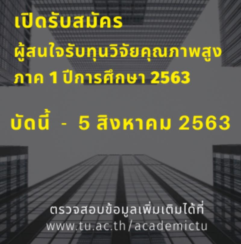 EZ Webmaster July 20, 2020 EZ Webmaster July 20, 2020 ประกาศ! รับสมัครทุนความร่วมมือ มธ. สวทช. เพื่อร่วมผลิตบัณฑิตวิจัยคุณภาพสูงระดับป.เอกและป.โท หลักสูตรเน้นวิจัย (research based) ข่าวดีสำหรับน้องๆ สายวิทยาศาสตร์และเทคโนโลยี ที่กำลังมองหางาน หรือ กำลังว่างงาน อยากใช้เวลาช่วงนี้พัฒนาศักยภาพของตนเองเพื่อยกระดับการศึกษาวิจัยให้สูงขึ้น ขณะนี้ สวทช. และ มหาวิทยาลัยธรรมศาสตร์ ได้ตกลงทำความร่วมมือเพื่อร่วมผลิตบัณฑิตวิจัยคุณภาพสูงระดับปริญญาเอกและปริญญาโท หลักสูตรเน้นวิจัย (research based) ภายใต้โครงการร่วมผลิตบัณฑิตวิจัยคุณภาพสูง(Excellent Research Graduate Scholarship) โดยเปิดรับสมัครข้อเสนอโครงการวิจัยของนักศึกษา(ใหม่ที่กำลังจะเข้าศึกษาปีการศึกษา 2563) ที่อยู่ในโครงการร่วมมือวิจัยของนักวิจัย สวทช. และอาจารย์ มธ. ที่มีความพร้อมด้านความร่วมมืออย่างแท้จริง และพร้อมดูแลให้คำปรึกษาแก่นักศึกษาที่เข้าร่วมโครงการ ในกลุ่มยุทธศาสตร์เป้าหมายของ สวทช. กับมหาวิทยาลัยธรรมศาสตร์ ใน 5 research areas ได้แก่ 1. เทคโนโลยีเกษตรและอาหาร 2. เทคโนโลยีสุขภาพและการแพทย์ 3. เทคโนโลยีพลังงานและสิ่งแวดล้อม 4. เทคโนโลยีดิจิทัลแนวสร้างสรรค์ 5. เทคโนโลยีเพื่อชุมชนและผู้ด้อยโอกาส เปิดรับใบสมัครที่มีข้อมูลครบถ้วนของนักวิจัย อาจารย์ และ นักศึกษา ตั้งแต่บัดนี้จนถึงวันที่ 5 สิงหาคม 2563 โดยสามารถอ่านรายละเอียดโครงการ คุณสมบัติของผู้สมัคร เงื่อนไขจากประกาศการรับทุนของมหาวิทยาลัยธรรมศาสตร์ได้ที่ https://drive.google.com/file/d/1S1IhQ033Tdk5RIEqEZsjdX02EOq1WhV0/view และสามารถดาวน์โหลดใบสมัครได้ที่ www.tu.ac.th/academictu