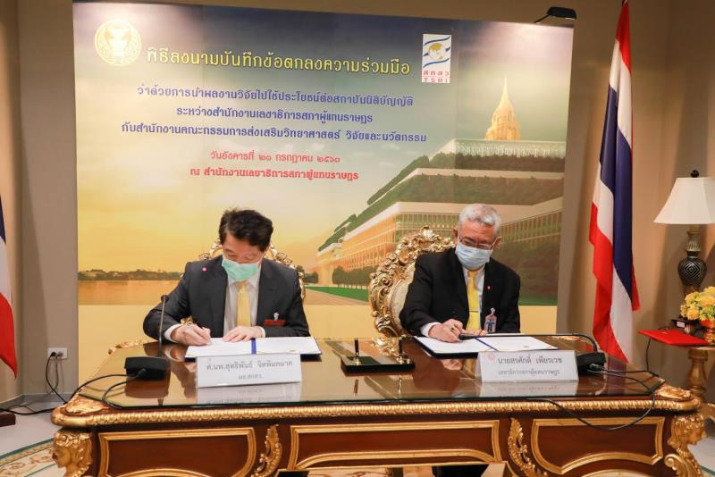 EZ Webmaster July 23, 2020 EZ Webmaster July 23, 2020 สกสว. ร่วมกับ สำนักงานเลขาธิการสภาผู้แทนราษฎร ลงนาม MOU สานพลังงานวิจัยตอบโจทย์พัฒนาประเทศด้านนิติบัญญัติ สกสว. ร่วมกับ สำนักงานเลขาธิการสภาผู้แทนราษฎร ลงนามบันทึกความตกลงว่าด้วยการนำผลงานวิจัยไปใช้ประโยชน์ต่อสถาบันนิติบัญญัติ ครอบคลุม 3 กิจกรรมใหม่ เชื่อมโยงระบบวิทยาศาสตร์ วิจัยและนวัตกรรมกับการพัฒนางานด้านนิติบัญญัติของประเทศ โอกาสนี้ได้คณะผู้จัดงานได้รับเกียรติจากท่าน ชวน หลีกภัย ประธานรัฐสภาและประธานสภาผู้แทนราษฎร ร่วมหารือแลกเปลี่ยนความคิดเห็นอย่างไม่เป็นทางการเกี่ยวกับการขับเคลื่อนงานวิจัยในการพัฒนาประเทศ วันนี้ (21 กรกฏาคม 2563) ที่ห้องรับรอง ชั้น 3 อาคารรัฐสภา ศาสตราจารย์ นายแพทย์สุทธิพันธ์ จิตพิมลมาศ ผู้อำนวยการสำนักงานคณะกรรมการส่งเสริมวิทยาศาสตร์ วิจัยและนวัตกรรม (สกสว.) พร้อมด้วย นายสรศักดิ์ เพียรเวช เลขาธิการสภาผู้แทนราษฎร ร่วมกันลงนามบันทึกข้อตกลงความร่วมมือว่าด้วยการนำผลงานวิจัยไปใช้ประโยชน์ต่อสถาบันนิติบัญญัติ ระหว่าง สำนักงานเลขาธิการสภาผู้แทนราษฎร กับ สำนักงานคณะกรรมการส่งเสริมวิทยาศาสตร์ วิจัยและนวัตกรรม เพื่อพัฒนากลไกส่งเสริมการนำผลงานวิจัยไปใช้ประโยชน์สู่ภาคนโยบายด้านนิติบัญญัติ ศ.นพ.สุทธิพันธ์ จิตพิมลมาศ ผู้อำนวยการ สกสว. เปิดเผยว่า การลงนามในบันทึกข้อตกลงความร่วมมือครั้งนี้ ถือเป็นการสานพลังความร่วมมืออย่างต่อเนื่องระหว่างสองหน่วยงานที่มีมาตั้งแต่เดิมคือ สำนักงานกองทุนสนับสนุนการวิจัย หรือ สกว. ปัจจุบันมีการเปลี่ยนบทบาทใหม่เป็น สกสว. สังกัดกระทรวงการอุดมศึกษา วิทยาศาสตร์ วิจัยและนวัตกรรม มีภารกิจในการจัดทำนโยบาย ยุทธศาสตร์ และแผนด้านวิทยาศาสตร์ วิจัยและนวัตกรรมของประเทศ ตลอดจนการจัดสรรงบประมาณกองทุนส่งเสริมวิทยาศาสตร์ วิจัยและนวัตกรรม ทั้งนี้ สกสว. ยังมีอีกหนึ่งภารกิจสำคัญคือ การพัฒนาระบบและกลไกส่งเสริมวิทยาศาสตร์ วิจัยและนวัตกรรม (ววน.) ให้มีการนำผลงานวิจัยไปใช้ให้เกิดประโยชน์สูงสุดในมิติต่าง ๆ จึงมีการสานต่อความร่วมมือนี้เพื่อก่อให้เกิดการสร้างเครือข่ายการเชื่อมโยงงานวิจัยกับภาคนโยบาย ฝ่ายนิติบัญญัติ มุ่งหวังให้เป็นกลไกเชิงสถาบันในการส่งผ่านข้อมูล ข้อค้นพบ และองค์ความรู้จากงานวิจัยไปสู่ฝ่ายนโยบายอย่างเป็นรูปธรรม โดยความร่วมมือครั้งนี้ยังได้ครอบคลุมไปถึงกิจกรรมใหม่ 3 กิจกรรมประกอบด้วย 1) การเชื่อมโยงงานวิจัยและเครือข่ายนักวิจัยในระบบ ววน. ทั่วประเทศ ให้เกิดการนำงานวิจัยไปใช้ประโยชน์กับทางนิติบัญญัติ ซ