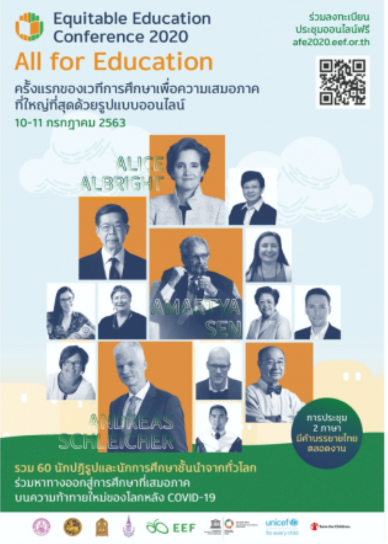 EZ Webmaster July 3, 2020 กสศ. เชิญร่วมงานประชุมวิชาการนานาชาติเพื่อความเสมอภาคทางการศึกษา: ปวงชนเพื่อการศึกษา เวทีแรกที่รวมนักปฏิรูปกว่า 60 คนจาก 14 ประเทศทั่วโลก ร่วมแก้ไขปัญหาความเหลื่อมล้ำทางการศึกษาหลังวิกฤตโควิด-19 EZ Webmaster July 3, 2020 กองทุนเพื่อความเสมอภาคทางการศึกษา (กสศ.) ร่วมกับองค์การยูเนสโก องค์การยูนิเซฟ องค์การช่วยเหลือเด็ก (Save the Children) กระทรวงศึกษาธิการ กระทรวงมหาดไทย กระทรวงพัฒนาสังคม และความมั่นคงของมนุษย์ เเละภาคีเครือข่าย กำหนดจัดงานประชุมวิชาการนานาชาติเพื่อความเสมอภาคทางการศึกษา: ปวงชนเพื่อการศึกษา (all for education) เพื่อเร่งแก้ปัญหาความเหลื่อมล้ำหลังวิกฤตโควิด-19 หลังคาดการณ์จะมีเด็กหลายล้านคนเสี่ยงหลุดออกจากระบบการศึกษา โดยงานจะจัดขึ้นในวันศุกร์ที่ 10 กรกฎาคม 2563 เวลา 08.30-16:00 น. และ ในวันเสาร์ 11 กรกฎาคม 2563 เวลา 09:00-15:00 น. โดยมีวัตถุประสงค์เพื่อร่วมหาแนวทางในการแก้ไขปัญหาความเหลื่อมล้ำทางการศึกษาในเวทีระดับสากล ภายในงาน สมเด็จพระกนิษฐาธิราชเจ้า กรมสมเด็จพระเทพรัตนราชสุดาฯ สยามบรมราชกุมารี เสด็จเป็นองค์ประธานในพิธีเปิด และ ทรงปาฐกถาพิเศษเรื่อง “สี่ทศวรรษ การทรงงานด้านการศึกษา และการพัฒนาคุณภาพชีวิตเด็ก และเยาวชนด้อยโอกาส” ร่วมฟังการประชุมจากนักวิชาการชื่อดังระดับจากทั่วโลก อาทิ อมาตย เซน (Amartya Sen) นักเศรษฐศาสตร์รางวัลโนเบล ที่เชี่ยวชาญด้านการแก้ปัญหาความยากจนและความเหลื่อมล้ำ อลิส ออร์ไบร์ท ประธานบริหารกองทุนการศึกษาโลก Global Partnership for Education (GPE) ซึ่งเป็นองค์กรที่ทำงานเพื่อสร้างการเปลี่ยนเเปลงด้านการศึกษาโดยเฉพาะ… Continue Reading