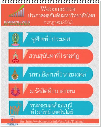 tui sakrapee July 27, 2020 “จุฬาฯ” ที่1ประเทศ “สวนสุนันทา” แชมป์ราชภัฏ 12 สมัย “มทร.อีสาน” ครองที่ 1 ราชมงคล ด้านม.รังสิต ยังที่1 ม.เอกชนจากอันดับ Webometrics Ranking July edition (2020.2.0 beta) tui sakrapee July 27, 2020 “จุฬาฯ” ที่1ประเทศ “สวนสุนันทา” แชมป์ราชภัฏ 12 สมัย “มทร.อีสาน” ครองที่ 1 ราชมงคล ด้านม.รังสิต ยังที่1 ม.เอกชนจากอันดับ Webometrics Ranking July edition (2020.2.0 beta) ………………………………………………………………………………………… Cybermetrics Lab แห่งสภาวิจัย (CSIC) ประเทศสเปน ได้ประกาศผลการจัดอันดับมหาวิทยาลัยทั่วโลกประจำเดือนกรกฎาคม 2020 แล้ว Universities: July edition… Continue Reading