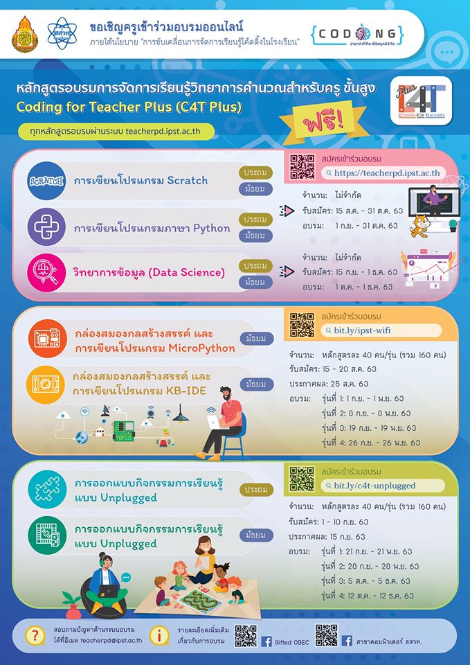 EZ Webmaster August 5, 2020 EZ Webmaster August 5, 2020 สสวท.เปิดอบรม “การจัดการเรียนรู้วิทยาการคำนวณออนไลน์” สำหรับครูฟรี! สถาบันส่งเสริมการสอนวิทยาศาสตร์และเทคโนโลยี (สสวท.) ขอเชิญคุณครูที่สนใจเข้าร่วมอบรมออนไลน์ในหลักสูตร “การจัดการเรียนรู้วิทยาการคำนวณสำหรับครู ขั้นสูง Coding for Teacher Plus (C4T Plus)” ฟรี จำนวน 7 หลักสูตร ได้แก่ -การเขียนโปรแกรม Scratch (ระดับประถม/มัธยม) -การเขียนโปรแกรมภาษา Python (ระดับประถม/มัธยม) รายละเอียด จำนวนรับ : ไม่จำกัด เปิดรับสมัคร : 15 สิงหาคม- 31 ตุลาคม 2563 ระยะเวลาการอบรม 1 กันยายน -31 ตุลาคม 2563 -วิทยาการข้อมูล (Data science) (ระดับประถม/มัธยม) รายละเอียด จำนวนรับ : ไม่จำกัด เปิดรับสมัคร :15 สิงหาคม- 1 ตุลาคม 2563 ระยะเวลาการอบรม 1 กันยายน -31 ธันวาคม 2563 -กล่องสมองกลสร้างสรรค์ และการเขียนโปรแกรม MicroPhython (ระดับมัธยม) -กล่องสมองกลสร้างสรรค์ และการเขียนโปรแกรม KB-IDE (ระดับมัธยม) รายละเอียด จำนวนรับ : 40 คน/รุ่น (รวม 160 คน) เปิดรับสมัคร : 15-20 สิงหาคม 2563 ประกาศผล : 25 สิงหาคม 2563 วัน/เวลาอบรม รุ่นที่ 1 ตั้งแต่วันที่ 1 กันยายน – 1 พฤศจิกายน 2563 รุ่นที่ 2 ตั้งแต่วันที่ 8 กันยายน – 8 พฤศจิกายน 2563 รุ่นที่ 3 ตั้งแต่วันที่ 19 กันยายน – 19 พฤศจิกายน 2563 รุ่นที่ 4 ตั้งแต่วันที่ 26 กันยายน – 26 พฤศจิกายน 2563 -การออกแบบกิจกรรมการเรียนรู้แบบ Unplugged (ระดับประถม) –การออกแบบกิจกรรมการเรียนรู้แบบ Unplugged (ระดับมัธยม) รายละเอียด จำนวนรับ : 40 คน/รุ่น (รวม 160 คน) เปิดรับสมัคร : 1-10 กันยายน 2563 ประกาศผล : 15 กันยายน 2563 วัน/เวลาอบรม รุ่นที่ 1 ตั้งแต่วันที่ 21 กันยายน – 21 พฤศจิกายน 2563 รุ่นที่ 2 ตั้งแต่วันที่ 28 กันยายน – 28 พฤศจิกายน 2563 รุ่นที่ 3 ตั้งแต่วันที่ 5 ตุลาคม – 5 ธันวาคม 2563 รุ่นที่ 4 ตั้งแต่วันที่ 12 ตุลาคม – 12 ธันวาคม 2563 โดยผู้เข้ารับการอบรมต้องผ่านการอบรมหลักสูตร Coding for Teacher C4T (online) มาก่อน (เตรียมไฟล์วุฒิบัตรสำหรับเป็นหลักฐานในการสมัคร) สามารถเข้าสมัครและอบรมได้ที่ : https://teacherpd.ipst.ac.th ขอบคุณข้อมูลจาก สาขาคอมพิวเตอร์ สสวท.