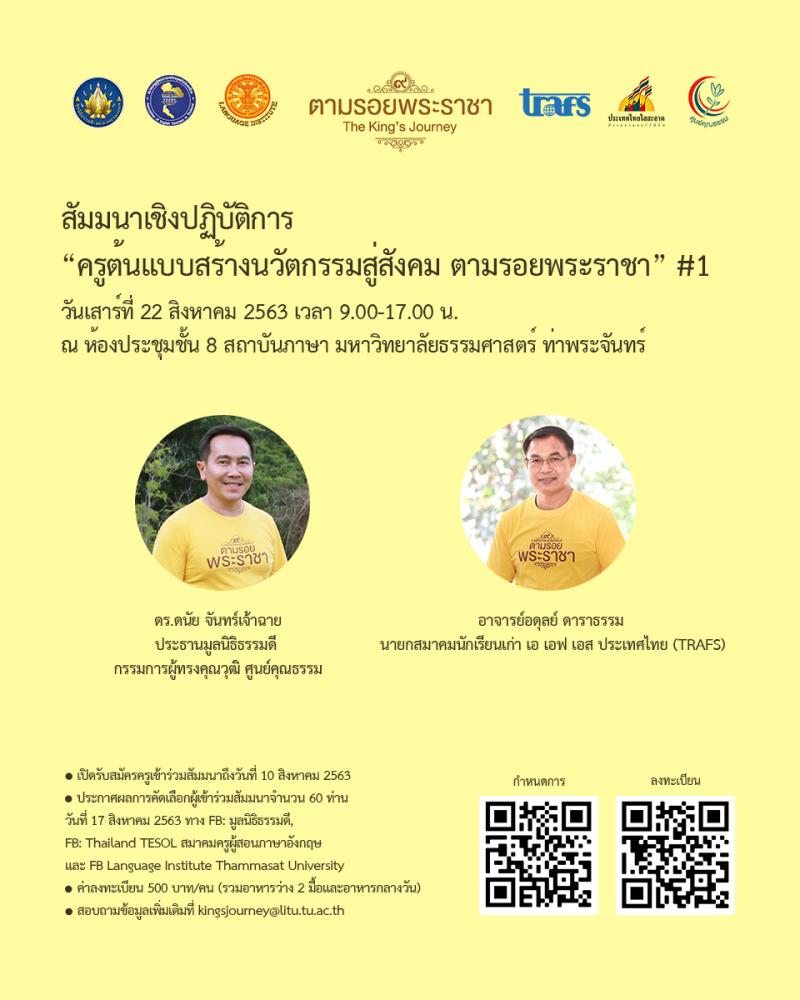 EZ Webmaster August 6, 2020 EZ Webmaster August 6, 2020 ครั้งแรก!! One Day Workshop The King’s Journey Learning Tools สร้างนวัตกรรมก้าวกระโดดทางการศึกษา ตามรอยศาสตร์พระราชาเพื่อความยั่งยืน มูลนิธิธรรมดี สมาคมครูผู้สอนภาษาอังกฤษแห่งประเทศไทย (Thailand TESOL) สถาบันภาษา มหาวิทยาลัยธรรมศาสตร์ สมาคมนักเรียนเก่า เอ เอฟ เอส ประเทศไทย (TRAFS) ศูนย์คุณธรรม (องค์การมหาชน) มูลนิธิประเทศไทยใสสะอาด และสำนักพิมพ์ดีเอ็มจี ขอเชิญชวนคุณครูทั่วประเทศเข้าร่วมอบรมโครงการ “ครูต้นแบบสร้างนวัตกรรมสู่สังคม ตามรอยพระราชา” สืบสาน รักษา ต่อยอด ศาสตร์พระราชา ผ่านการทำกิจกรรมเสริมทักษะเรียนรู้ สอดแทรกคุณธรรม 4 ประการ คือ พอเพียง วินัย สุจริต จิตอาสา พร้อมต่อยอดการสร้างนวัตกรรมแบบก้าวกระโดด และสร้างสรรค์พัฒนาสื่อการเรียนการสอนภาษาอังกฤษเพื่อสังคม จัดในวันเสาร์ที่ 22 สิงหาคม 2563 เวลา 09.00 – 17.00 น. ณ ห้องประชุม ชั้น 8 สถาบันภาษา มหาวิทยาลัยธรรมศาสตร์ ท่าพระจันทร์ โครงการนี้เปิดรับสมัครโดยมีค่าลงทะเบียนเพียง 500 บาท (สำหรับค่าอาหารกลางวัน และ เบรก 2 มื้อ) รับสมัครถึงวันที่ 10 สิงหาคม 2563 เท่านั้น ท่านอาจารย์ที่สนใจสามารถลงทะเบียนได้ลิงค์นี้ https://forms.gle/SvzmxySU1YGSZ1N38 หรือสแกน QR Code ได้ในโปสเตอร์ ประกาศผลการคัดเลือก วันที่ 17 สิงหาคม 2563 ทาง FB Pages : Thailand TESOL สมาคมครูผู้สอนภาษาอังกฤษแห่งประเทศไทย และมูลนิธิธรรมดี