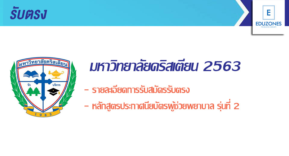 EZ Webmaster August 16, 2020 EZ Webmaster August 16, 2020 คณะพยาบาลศาสตร์ ม.คริสเตียน เปิดรับสมัครหลักสูตรประกาศนียบัตรผู้ช่วยพยาบาล ปี รุ่นที่ 2 ถึง 26 ต.ค.นี้ คณะพยาบาลศาสตร์ มหาวิทยาลัยคริสเตียน เปิดรับสมัครและสอบคัดเลือกบุคคลเข้าศึกษาต่อหลักสูตรประกาศนียบัตรผู้ช่วยพยาบาล ปีการศึกษา 2563 รุ่นที่ 2 ตั้งแต่วันที่ 20 กรกฎาคม – 26 ตุลาคม 2563 ทางเว็บไซต์ https://estudent.christian.ac.th/admission/ กำหนดการ -เปิดรับสมัคร ตั้งแต่วันที่ 20 กรกฎาคม – 26 ตุลาคม 2563 คุณสมบัติของผู้สมัคร -เป็นเพศชาย หรือเพศหญิง อายุไม่ต่ำกว่า 16 ปีบริบูรณ์ -เป็นผู้สำเร็จการศึกษาระดับมัธยมศึกษาตอนปลาย (ม.6) หรือเทียบเท่า -เป็นผู้มีส่วนสูง ไม่ต่ำกว่า 150 เซนติเมตร และมีน้ำหนักตัวไม่ต่ำกว่า 40 กิโลกรัม ช่องทางการสมัคร -สมัครทางออนไลน์ผ่านเว็บไซต์ https://estudent.christian.ac.th/admission/ -สมัครด้วยตนเอง ที่ศูนย์รับสมัครนักศึกษา ชั้น 1 อาคารบริหาร มหาวิทยาลัยคริสเตียน จังหวัดนครปฐม หรือชั้น 8 ศูนย์ศึกษาสยามคอมเพล็กซ์ อาคารสำนักงานสภาคริสตจักรในประเทศไทย กรุงเทพฯ เอกสารประกอบการสมัคร -ใบสมัครที่กรอกรายละเอียดครบถ้วน -สำเนาบัตรประจำตัวประชาชน จำนวน 1 ฉบับ -สำเนาทะเบียนบ้าน จำนวน 1 ฉบับ -สำเนาใบแสดงผลการเรียนชั้นมัธยมศึกษาปีที่ 6 จำนวน 1 ฉบับ -รูปถ่ายหน้าตรง ขนาด 1 นิ้ว จำนวน 2 รูป เกณฑ์การพิจารณารับเข้า -การสอบสัมภาษณ์ -การตรวจร่างกาย สำหรับผู้ที่สนใจสมัครสามารถดูรายละเอียดการสมัครเพิ่มเติม ได้ที่ >>> https://service.christian.ac.th/nurse/course_assistant.php หรือทางเว็บไซต์ www.christian.ac.th ขอบคุณข้อมูลจาก -เว็บไซต์มหาวิทยาลัยคริสเตียน