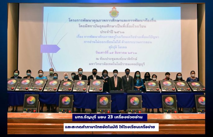 tui sakrapee August 15, 2020 มทร.ธัญบุรี มอบ 23 เครื่องช่วยอ่านและสะกดคำภาษาไทยอัตโนมัติ ให้โรงเรียนเครือข่าย tui sakrapee August 15, 2020 เมื่อวันที่ 15 สิงหาคม 2563 รองศาสตราจารย์ ไพบูลย์ แย้มเผื่อน ที่ปรึกษามหาวิทยาลัยเทคโนโลยีราชมงคล (มทร.ธัญบุรี) มอบสื่อ “ชุดอาดุยอิโน่ทัชเกมการอ่านคำภาษาไทย” ให้กับโรงเรียนเครือข่าย 23 โรงเรียน กิจกรรมพัฒนาครูกลุ่มสาระการเรียนรู้ภาษาไทย ตามกระบวนการ PLC แก้ปัญหาการอ่านไม่ออกเขียนไม่ได้ รูปแบบ สุ จิ ปุ ลิ โมเดล ระดับประถมศึกษา ในโครงการพัฒนาคุณภาพการศึกษาและการพัฒนาท้องถิ่นโดยมีสถาบันอุดมศึกษาเป็นพี่เลี้ยงโรงเรียนเครือข่ายเพื่อการพัฒนาอุดมศึกษาภาคกลางตอนบน ณ ห้องประชุมสงค์ธนาพิทักษ์ อาคารเฉลิมพระเกียรติ48 พระชันษาฯ มหาวิทยาลัยเทคโนโลยีราชมงคล… Continue Reading