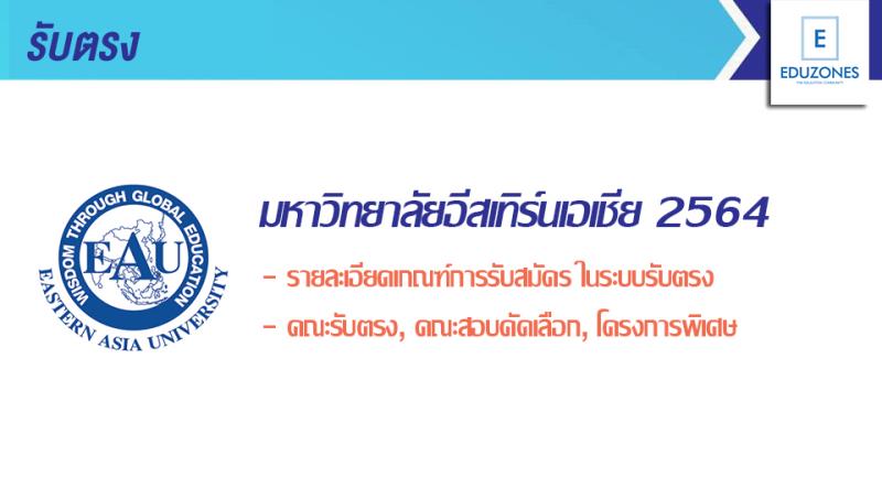 EZ Webmaster October 19, 2020 EZ Webmaster October 19, 2020 #รับตรง64 ม.อีสเทิร์นเอเชีย เปิดรับสมัครนศ.ป.ตรี ประจำปีการศึกษา 2564 ถึง 30 ธ.ค.นี้ มหาวิทยาลัยอีสเทิร์นเอเชีย เปิดรับสมัครบุคคลเพื่อเข้าศึกษาต่อในระดับปริญญาตรี ประจำปีการศึกษา 2564 ตั้งแต่วันนี้ – 30 ธันวาคม 2564 โดยเปิดรับทั้ง 3 รอบ ดังนี้ -คณะรับตรง -คณะสอบคัดเลือก -โครงการพิเศษ เรียนวันเสาร์-อาทิตย์ รายละเอียดการรับสมัคร คณะรับตรง ได้แก่ คณะศิลปศาสตร์ / คณะบริหารธุรกิจ / หลักสูตรประกาศนียบัตรผู้ช่วยพยาบาล (หลักสูตร 1 ปี) ไม่ต้องสอบเข้า ไม่จำกัดเกรด ไม่ต้องสัมภาษณ์ ไม่ตัดสิทธิ์แอดมิชชั่น คณะสอบคัดเลือก ได้แก่ คณะพยาบาลศาสตร์ / คณะการบิน / คณะเภสัชศาสตร์ สาขาวิชาเภสัชศาสตร์ โครงการพิเศษ เรียนวันเสาร์-อาทิตย์ ได้แก่ คณะวิทยาการจัดการ สาขาวิชาการจัดการและการบริหาร / คณะเทคโนโลยีสารสนเทศ สาขาวิชาเทคโนโลยีสารสนเทศ / คณะบริหารธุรกิจ หลักสูตรบัญชีบัณฑิต / คณะวิศวกรรมศาสตร์ สาขาวิชาวิศวกรรมไฟฟ้าและพลังงาน / คณะนิติศาสตร์ หลักสูตรนิติศาสตร์บัณฑิต / คณะสาธารณสุขศาสตร์ สาขาวิชาสาธารณสุขชุมชน กำหนดการ คณะรับตรง เปิดรับสมัครตั้งแต่วันนี้ – 10 ตุลาคม 2563 สอบคัดเลือก วันที่ 18 ตุลาคม 2564 (หากจำนวนเต็มก่อนปิดรับก่อน) คณะสอบคัดเลือก เปิดรับสมัครตั้งแต่วันนี้ – 30 ธันวาคม 2563 สอบคัดเลือก วันที่ 16 มกราคม 2564 (หากจำนวนเต็มก่อนปิดรับก่อน) คุณสมบัติของผู้สมัคร -เป็นกำลังศึกษาอยู่ หรือสำเร็จการศึกษาชั้นมัธยมศึกษาปีที่ 6 หรือ เทียบเท่า -เป็นผู้มีเกรดเฉลี่ยสะสม (GPAX ) ขั้นต่ำ ตามที่กำหนด ช่องทางการสมัคร -แฟนเพจเฟซบุ๊ก สมัครเรียน ม.อีสเทิร์นเอเชีย สำหรับผู้ที่สนใจสมัครเข้าศึกษาต่อสามารถเข้าไปศึกษาเพิ่มเต้ม ได้ที่ >>> สายตรง : 095-496-9903 หรือ ID Line : society-jiew14 ขอบคุณข้อมูลจาก -เว็บไซต์มหาวิทยาลัยอีสทิร์นเอเชีย